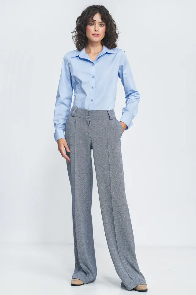 Po wielu sezonach dominacji wąskich spodni, powróciły modele z szerokimi nogawkami, tak zwane wide leg. Spodnie tego typu tworzą zgrany duet wraz z oversizowa marynarką w tym samym kolorze lub wzorze. Posiadają lekko podwyższony stan, dzięki czemu wydłużają optycznie sylwetkę. Dzięki materiałowi z przewagą wiskozy będziesz czuć się komfortowo przez cały dzień. Skład: 65% wiskoza, 30% poliester, 5% poliuretan Modelka na zdjęciu ma 176 cm wzrostu i ma sobie rozmiar 36.