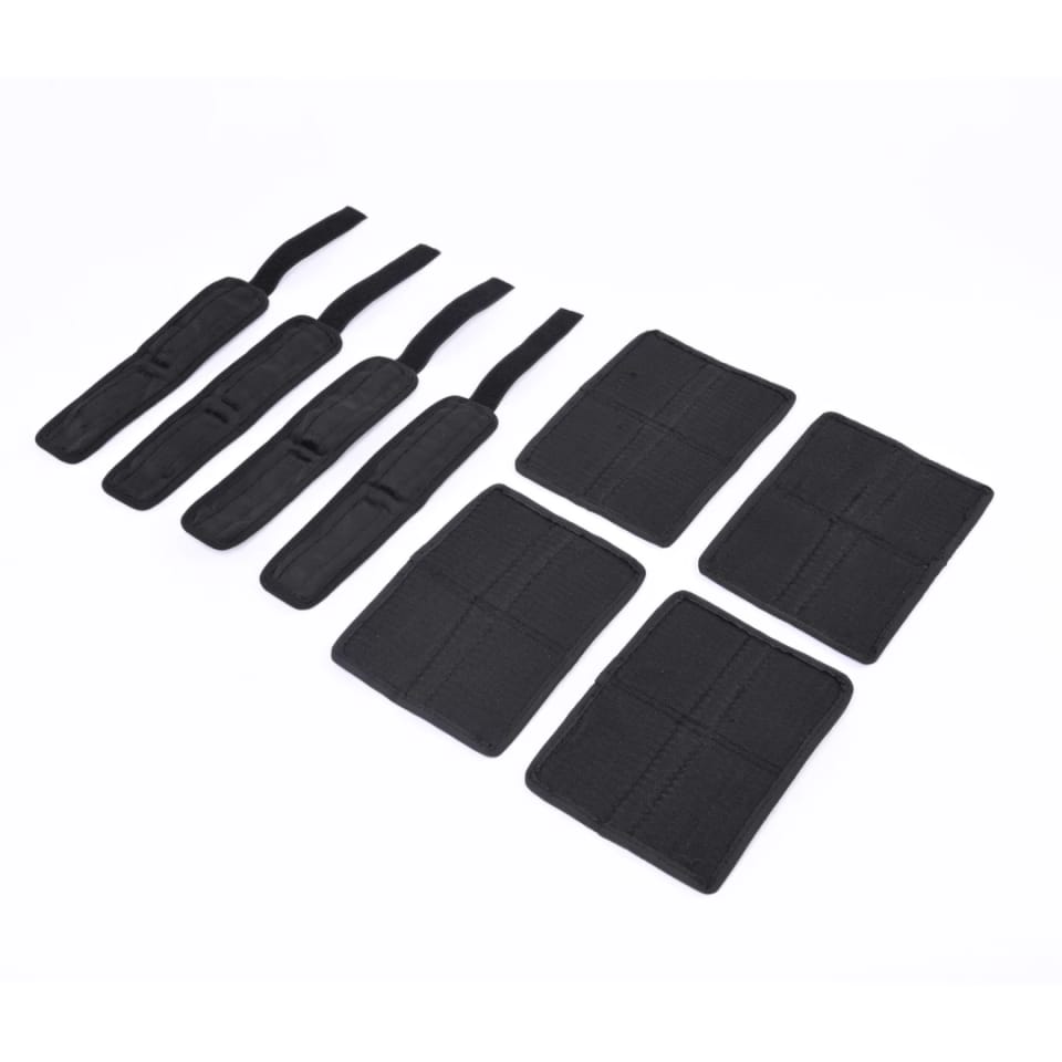 - W zestawie cztery uniwersalne nakładki na rzepy, do ktorych można łatwo przypiąć rożnego rodzaju akcesoria z karabińczykami.