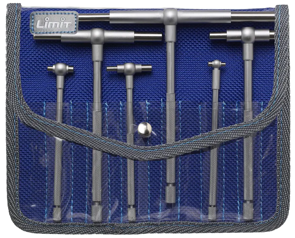 Sprawdziany średnicowe nastawne. Zestaw z 6 szt. Narzędzie zbudowane jest z dwóch sprężyście rozsuwanych cylindrycznych trzpieni. Ze stali hartowanej. Zablokowanie ustawienia odbywa się poprzez pokrętło śruby w górnej części trzonka. Odczytu dokonuje się za pomocą mikrometru.