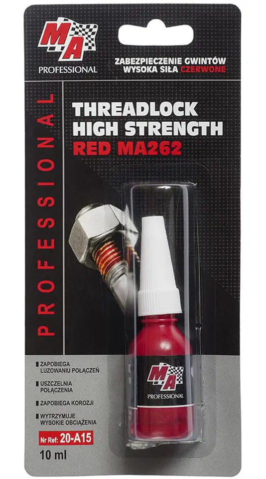 Zabezpieczenie gwintów – Wysoka siła – czerwony. Zapobiega luzowaniu połączeń i korozji. Uszczelnia połączenia. Wytrzymuje wysokie obciążenia.