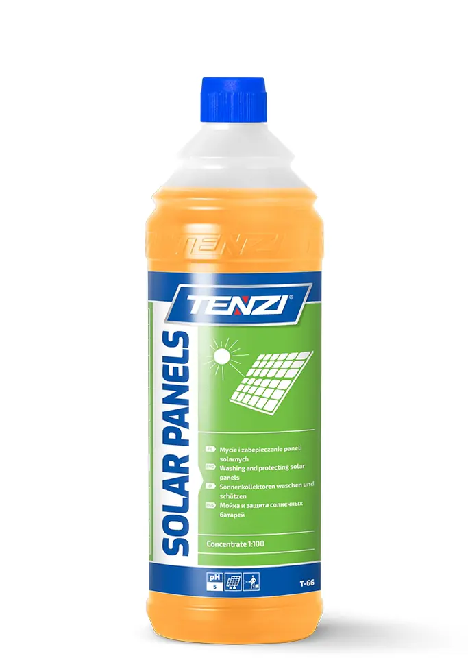 Lekko kwaśny produkt w koncentracie do mycia paneli solarnych wraz z ich zabezpieczeniem przed ponownym osadzaniem się pyłów. Usuwa brud eksploatacyjny (sadza, kurz, pył) oraz mineralny (nacieki i osady wodne, atmosferyczne).