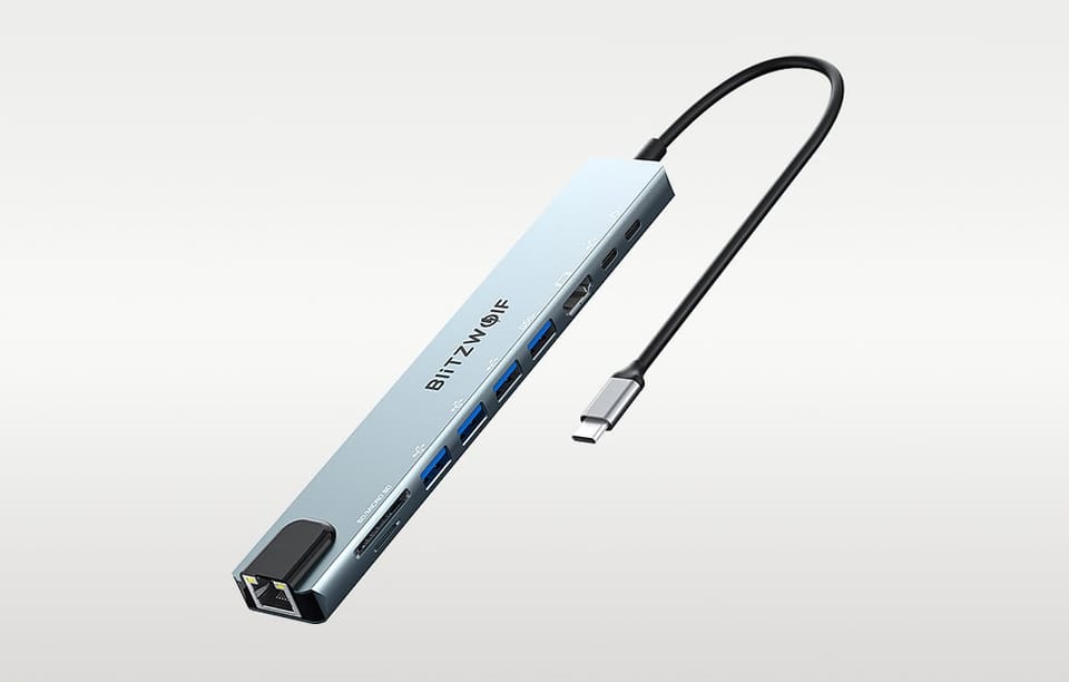 Blitzwolf BW-TH5 oferuje port na kartę SD oraz kartę TF, umożliwiając szybki dostęp do plików zapisanych na tych nośnikach. Posiada także port ładowania PD, który obsługuje moc do 100W, zapewniając szybkie i efektywne ładowanie urządzeń. Złącze RJ45 Ethernet umożliwia stabilne i szybkie połączenie z internetem o prędkości do 100Mbps, co jest niezbędne w przypadku pracy z dużymi plikami lub transmisji strumieniowej.