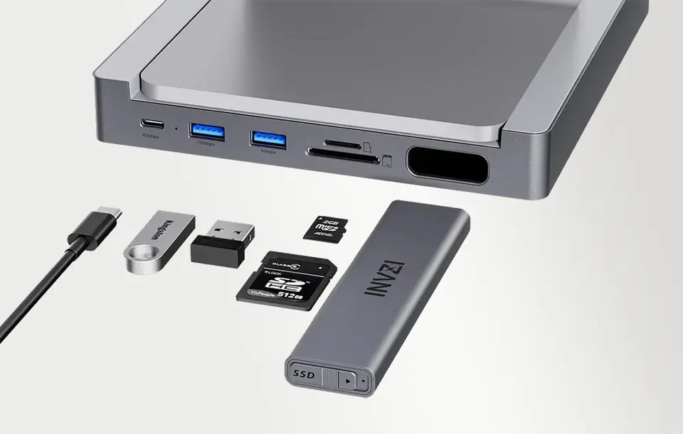 Jednym z wyróżniających się elementów Huba INVZI jest wysuwana obudowa na dysk SSD. Obsługuje ona dyski NVMe oraz SATA M.2, co pozwala na łatwe rozbudowanie przestrzeni dyskowej laptopa. Co więcej, umożliwia dodanie dodatkowej pamięci do iMaca do 4 TB, dzięki czemu możesz bez problemu zwiększyć pojemność swojego komputera stacjonarnego. To idealne rozwiązanie dla osób, które potrzebują dużo miejsca na swoje pliki i dokumenty, a jednocześnie cenią sobie wygodę i łatwość podłączenia urządzeń.