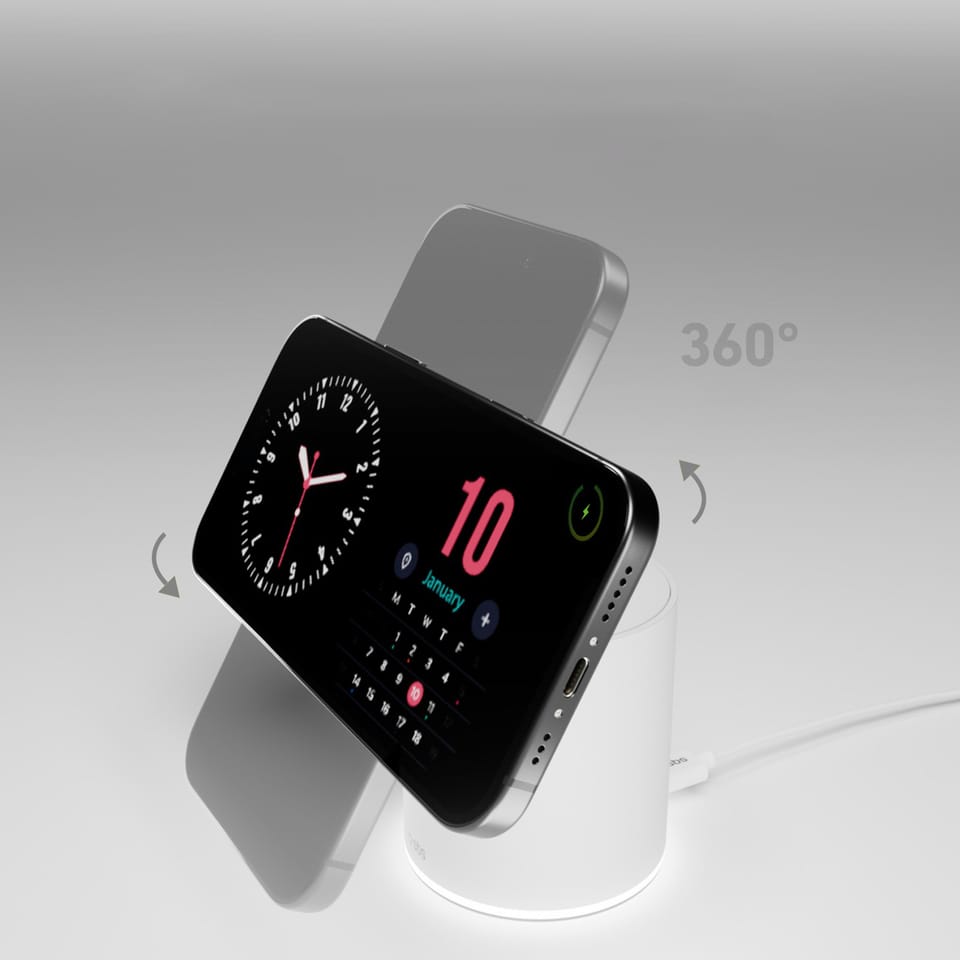 - - Składany stojak: umożliwia ładowanie telefonu w pozycji pionowej lub poziomej, idealne do oglądania filmów czy rozmów wideo.