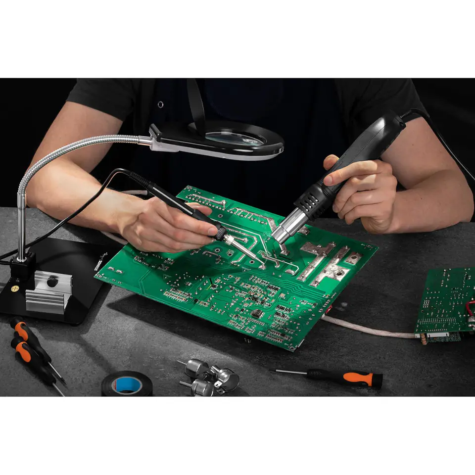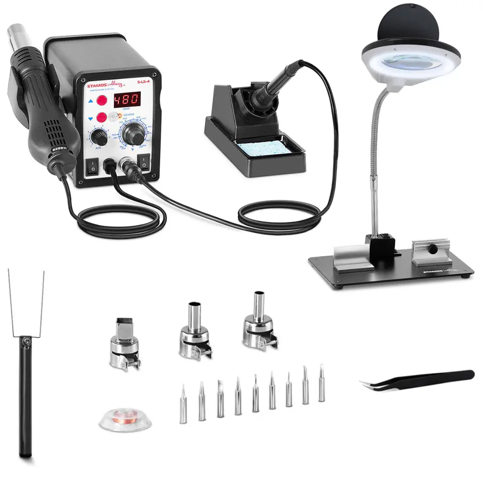 Nazwa producenta: S-LS-4Uniwersalna Stacja lutownicza niemieckiego producenta STAMOS SOLDERING wykonana z wysokiej jakości, oryginalnych komponentów.Urządzenie łączy w sobie kilka funkcji niezbędnych przy wykonywaniu profesjonalnych prac lutowniczych z układami elektronicznymi takimi jak SOIC, QFP, PLCC, BGA, SMD itp. Urządzenie sterowane jest w pełni cyfrowo i kontrolowane przez zaawansowany układ PID zapewniający bardzo precyzyjne sterowanie temperaturą.W skład zintegrowanej stacji lutowniczej wchodzą urządzenia:LUTOWNICA - KOLBA GROTOWA z mocą 60W z zabezpieczeniem chroniącym układy elektroniczne ESD SafeMODUŁ HOT AIR z wydajną grzałką 650W oraz wentylatorem zapewniającym przepływ powietrza 120 l/min. Kolba z nadmuchem gorącego powietrza posiada wiele zastosowań między innymi:- lutowanie oraz rozlutowywanie komponentów montowanych powierzchniowo (SMD)- nagrzewanie i rozmrażanie- obkurczanie koszulek termokurczliwych- rozpuszczanie klejów- opalanie farb- spawanie plastiku- wiele innych zastosowań gdzie niezbędna jest temperatura od 100 do 450 deg;CParametry techniczne: