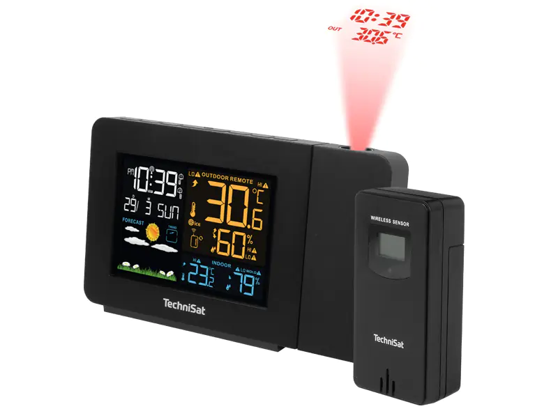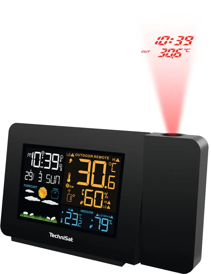 iMETEO P1 ma czytelny, kolorowy, podświetlany wyświetlacz LCD o wymiarach 90x60 mm. Stacja posiada również praktyczną funkcję projektora, który pozwala na projekcję danych, na ścianie twojej sypialni. W ten sposób wyświetlisz aktualny czas oraz temperaturę otoczenia. Zasięg maksymalny czujnika to aż 60 metrów.