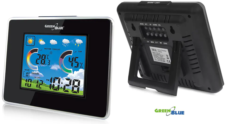 Stacja pogody bezprzewodowa IN/OUT temperatura wilgotność barometr ładowarka USB GreenBlue GB145 black