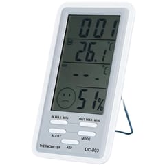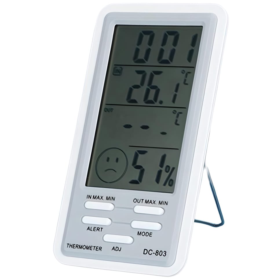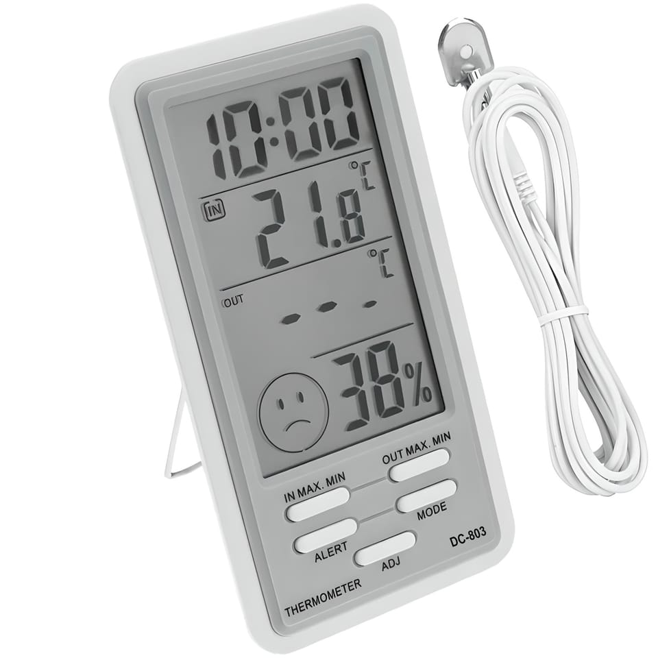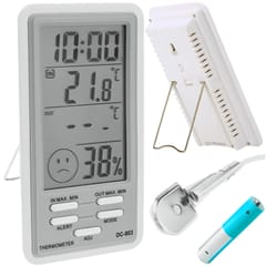 Kod produktu: 1030058Wielofunkcyjny elektroniczny termometr z higrometrem i budzikiem to praktyczne urządzenie do codziennego kontrolowania temperatury i wilgotności powietrza w pomieszczeniu. Wyposażony w duży, czytelny wyświetlacz LCD, umożliwia łatwy odczyt wszystkich wartości. Może być postawiony na płaskiej powierzchni lub powieszony na ścianie. Dzięki prostej obsłudze i eleganckiemu, białemu wykończeniu pasuje do każdego wnętrza - domu, biura czy mieszkania.Cechy produktu: