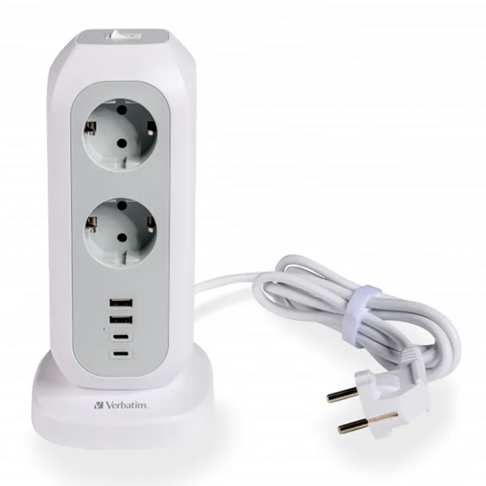 Wieża zasilania UE Verbatim może rozszerzyć gniazdo typu europejskiego na 11 gniazd AC oraz dwa porty USB-C i dwa porty USB-A. Ta wieża wielowtykowa z 2-metrowym przewodem przedłużającym zapewnia wszystkie potrzebne gniazda, dzięki którym możesz ładować swoje urządzenia i korzystać z nich z pełną mocą.