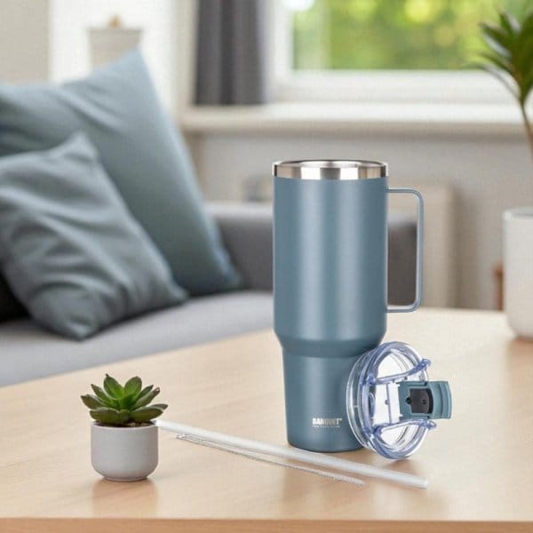 Ten duży kubek termiczny to idealne rozwiązanie dla osób, które potrzebują trwałego i funkcjonalnego naczynia na gorące lub zimne napoje. Wyposażony w zamykany ustnik oraz opcjonalną słomkę pozwala korzystać z niego na 2 sposoby. Doskonale sprawdzi się w podróży, na siłowni, w pracy, czy na co dzień.Cechy produktu: Duża pojemność – 1200 ml, dzięki czemu świetnie nadaje się do dłuższych wyjść, podróży, czy intensywnego dnia. Stal nierdzewna – Wykonany z wysokiej jakości materiałów, kubek jest odporny na rdzę, łatwy w czyszczeniu i bardzo trwały. Podwójne ścianki – Zapewniają doskonałą izolację termiczną, utrzymują temperaturę napojów gorących i zimnych do 8 godzin Szczelne zamknięcie – Zapobiega przypadkowemu wylaniu napoju, co czyni go bezpiecznym w transporcie. Ustnik i słomka – Wygodne rozwiązanie do picia zarówno w ruchu, jak i podczas odpoczynku. Ustnik można łatwo zamknąć, zapewniając dodatkową ochronę przed wyciekami. Ergonomiczny kształt i rączka – Zapewnia wygodny chwyt, zwężana podstawa umożliwia umieszczenie go w uchwycie samochodowym. Ekologiczne rozwiązanie – Wielorazowe użytkowanie zmniejsza ilość odpadów, co czyni go przyjaznym dla środowiska. Stylowy design – Nowoczesny, modny designZastosowanie: W podróży: Idealny na kawę, herbatę czy wodę. Na siłownię: Duża pojemność doskonała dla sportowców, pozwoli zabrać koktajl na siłownię Do pracy lub szkoły: Utrzyma napój w odpowiedniej temperaturze przez cały dzień.Wymiary i waga: Pojemność: 1200 ml Wysokość: 26 cm Średnica: 10 cm Średnica podstawy: 8 cm Waga: 590 g Kolor: szaryZalety produktu: Uniwersalny i praktyczny Wytrzymały i odporny na codzienne użytkowanie Łatwy w utrzymaniu czystości Szczelność zapewnia bezpieczeństwo w transporcie Modny designZainwestuj w wygodę i jakość, która sprawdzi się w każdej sytuacji!...