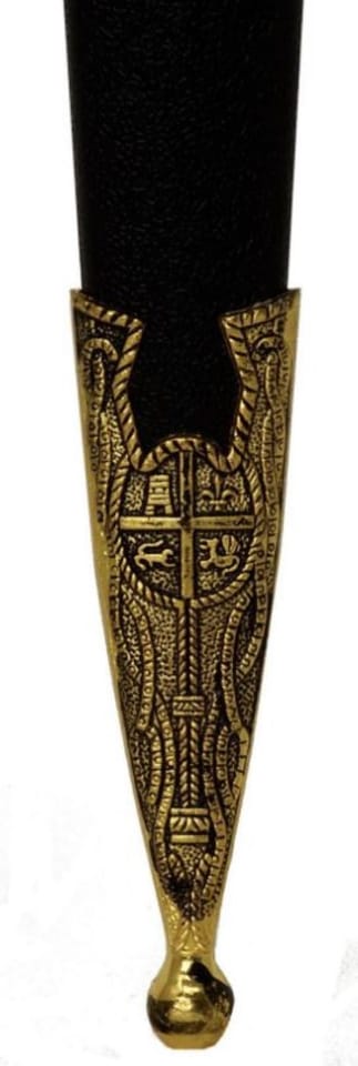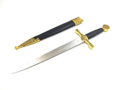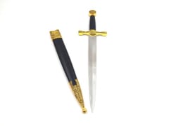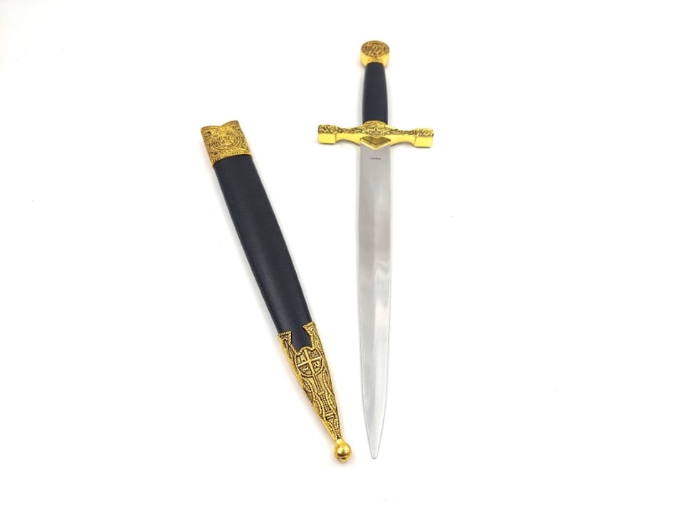 Stalowy sztylet rycerski - replika SW-168 Replika średniowiecznego sztyletu rycerskiego w pochwie - przedmiot dekoracyjny To nie jest broń - sztylet ma stępione ostrze Długość - 39,5cm ; waga 0,33 kg Wykonany ze stali nierdzewnej Ozdobna pochwa w komplecie Estetyczne pudełko prezentowe Uwaga! Sztylet nie jest zabawką. Ma charakter dekoracyjny. Należy chronić przed dziećmi. Nie należy powierzać osobom poniżej 18 roku życia!