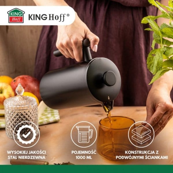 Jego pojemność 1 litra pozwala przygotować napój dla kilku osób jednocześnie, a metalowy tłok z drobną siateczką zapewnia czysty, klarowny napar bez fusów. Smukła forma, czarna powłoka i stabilna konstrukcja sprawiają, że KH-1996 prezentuje się wyjątkowo nowocześnie i pasuje do każdej aranżacji kuchni.