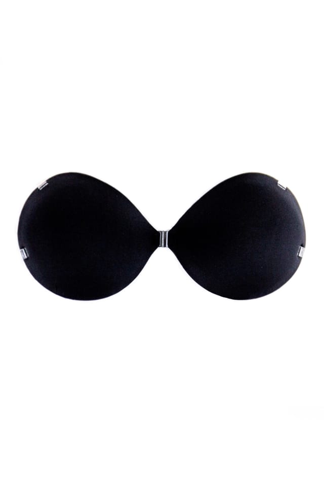 Materiałowy biustonosz samonośny w kolorze czarnym. Model posiada doskonale wyprofilowane miseczki, pokryte od wewnątrz bezpiecznym dla skóry - a jednocześnie mocnym - silikonowym klejem. Dzięki temu biustonosz będzie się doskonale trzymać na właściwym miejscu. Dodatkowe zabezpieczenie stanowią silikonowe, odpinane paski, zapinane wokół szyi lub na plecach - w zależności od potrzeb czy danej kreacji. Miseczki biustonosza są zapinane na niewielką sprzączkę, aby dać Ci lepszy efekt push-up.