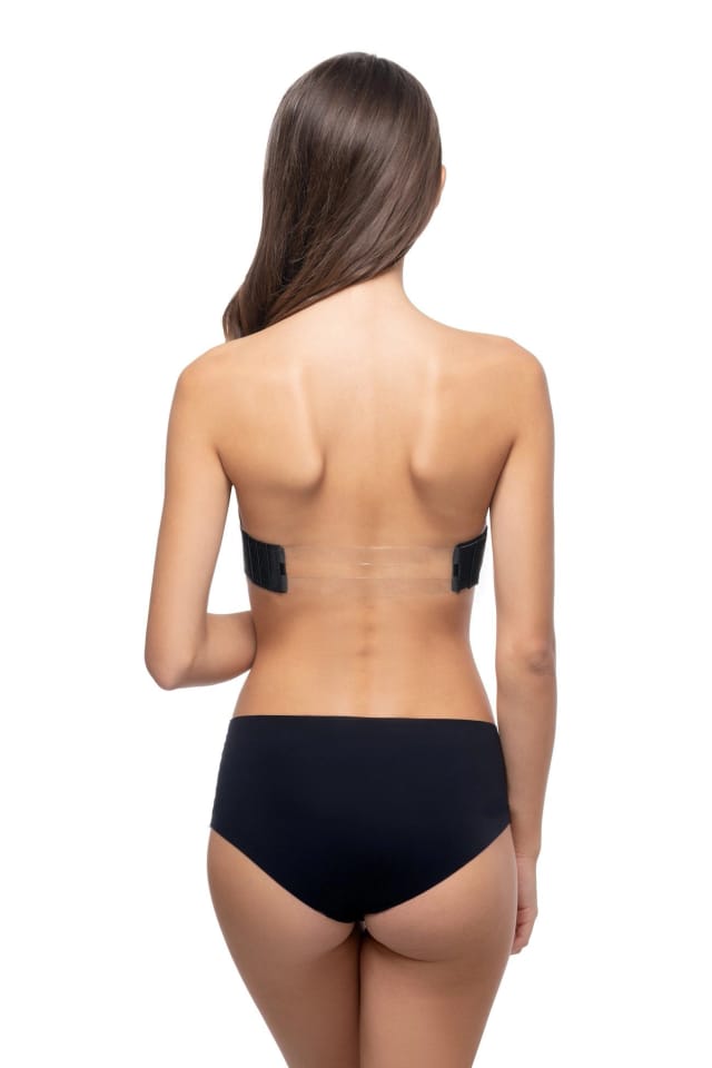 Lekki biustonosz samonośny pięknie modelujący biust. Zapinany po bokach, do wyboru tył materiałowy lub silikonowy. Miseczki z zewnątrz obszyte gładkim materiałem. Zapewnia naturalny wygląd i komfort. Dostępny w dwóch kolorach: czarnym oraz beżowym.