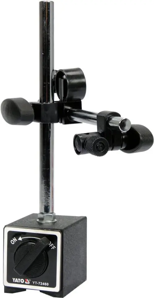 Profesjonalny statyw magnetyczny YT-72460 do czujników zegarowych YT-72450 i YT-72453. Posiada przegub sprężysty dla dokładnego pozycjonowania czujnika zegarowego na mierzonym elemencie. Centralne blokowanie pokrętłem jednocześnie środkowego i górnego przegubu. Podstawa magnetyczna z rowkiem pryzmatycznym od spodu. Duża siła przyciągania zapewnia stabilne i pewne połączenie z elementami metalowymi - odpięcie elementu realizowane jest specjalnym pokrętłem.
