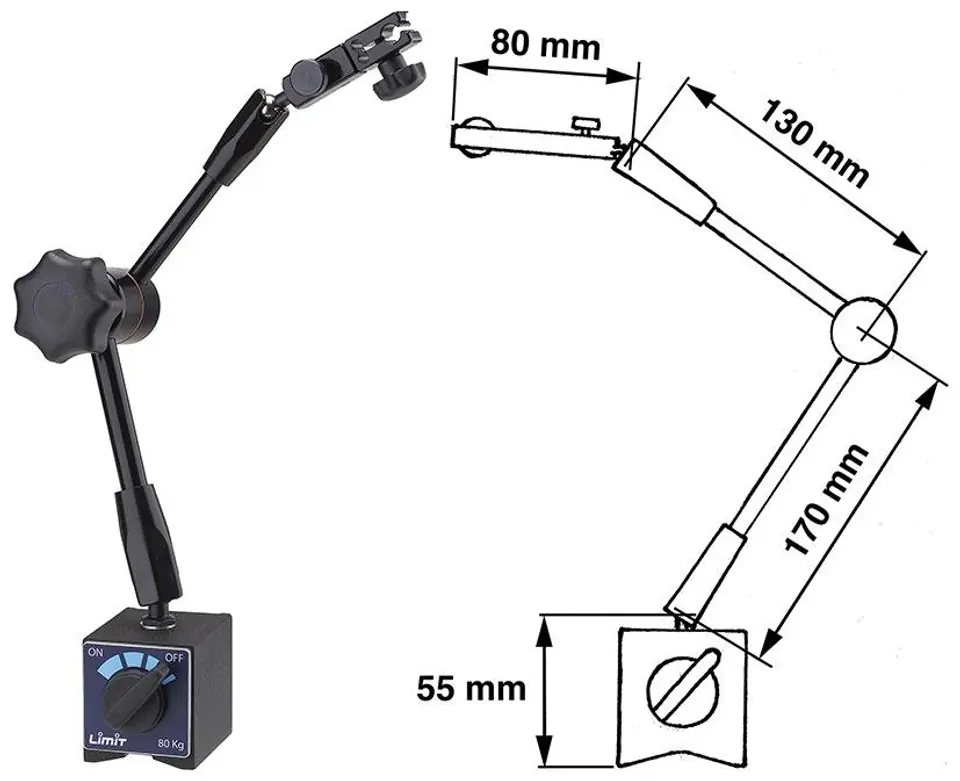 Z mechanizmem ustawiania dokładnego w górnym uchwycie. Wyposażony w otwór na osadzenie czujnika zegarowego, oraz rowek trapezowy do czujnika wychylnego dźwigniowego. Centralne blokowanie pokrętłem jednocześnie dolnego, środkowego i górnego przegubu. Podstawa magnetyczna z rowkiem pryzmatycznym od spodu. Dostarczany bez czujnika.