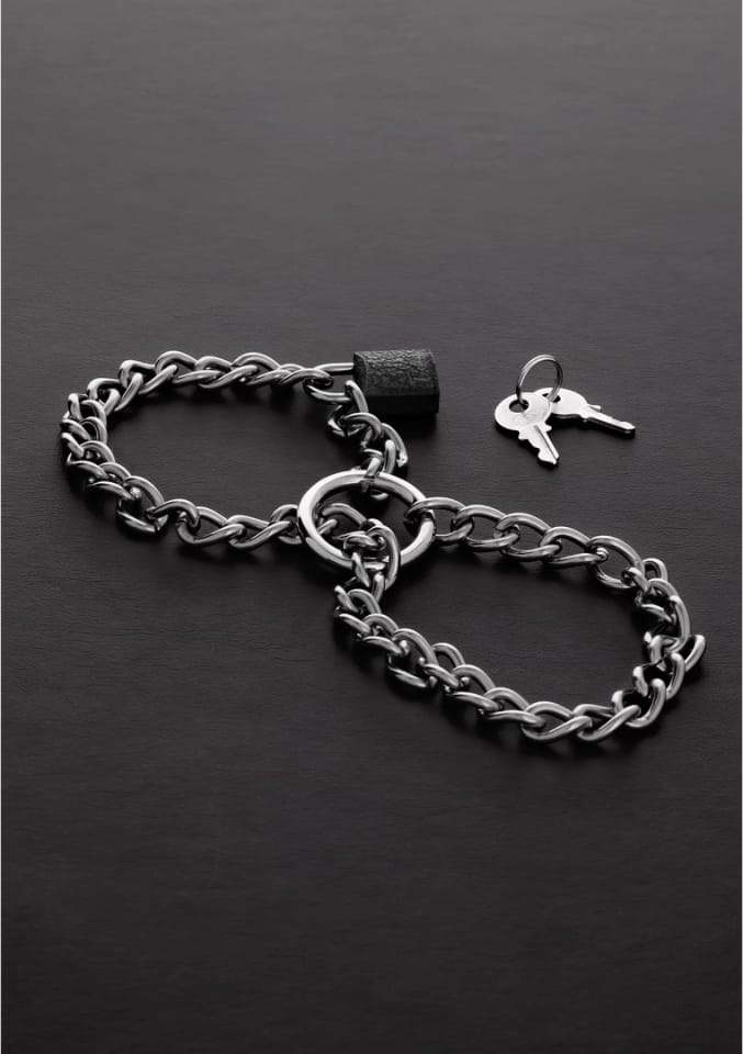 Steel – Stalowe mankiety z łańcuchem i możliwością blokady to solidny model przeznaczony do bezpiecznego ograniczenia ruchow nadgarstkow lub kostek. Produkt został wykonany z wysokogatunkowej stali nierdzewnej, co zapewnia mu trwałość oraz łatwość w utrzymaniu czystości. System składa się z dwoch dużych pierścieni połączonych wytrzymałym łańcuchem, ktory można w prosty sposob przepleść, tworząc pewne i anatomiczne zamknięcie wokoł wybranej części ciała. Po zapięciu całość zabezpiecza się przy pomocy kłodki (brak w zestawie), co dodatkowo podnosi poziom bezpieczeństwa użytkowania.
