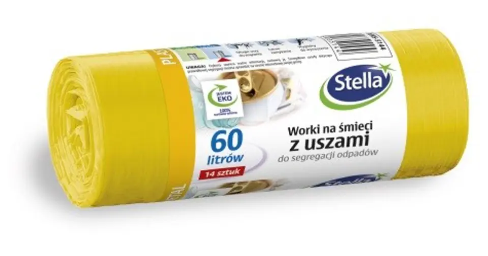 Ekologiczny worki na śmieci z uszami Stella do pakowania i segregowania odpadów plastikowych i metalowych. Żółty worek do segregacji śmieci jest przeznaczony do zbiórki odpadów z plastiku i metalu. Do żółtego worka na odpady możemy wrzucić: plastikowe butelki po napojach i opakowania po produktach spożywczych, plastikowe worki, reklamówki, folie aluminiowe, opakowania wielomateriałowe (np. kartony po mleku i sokach), opakowania po środkach czystości i kosmetykach, puszki po napojach i konserwach, zakrętki od słoików i kapsle, zabawki wykonane w całości z plastiku. Worki do segregacji odpadów są wykonane z grubej folii LDPE z regranulatu, dzięki czemu są wytrzymałe na obciążenia i przypadkowe rozdarcia. Mają mocny zgrzew typu gwiazda, co oznacza że nie przeciekają i świetnie pasują do okrągłych pojemników na odpady. Idealnie sprawdzają się w domu, biurach, miejscach publicznych. Jedno opakowanie zawiera 14 sztuk worków o pojemności 60 litrów.