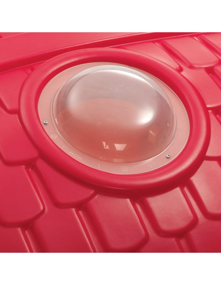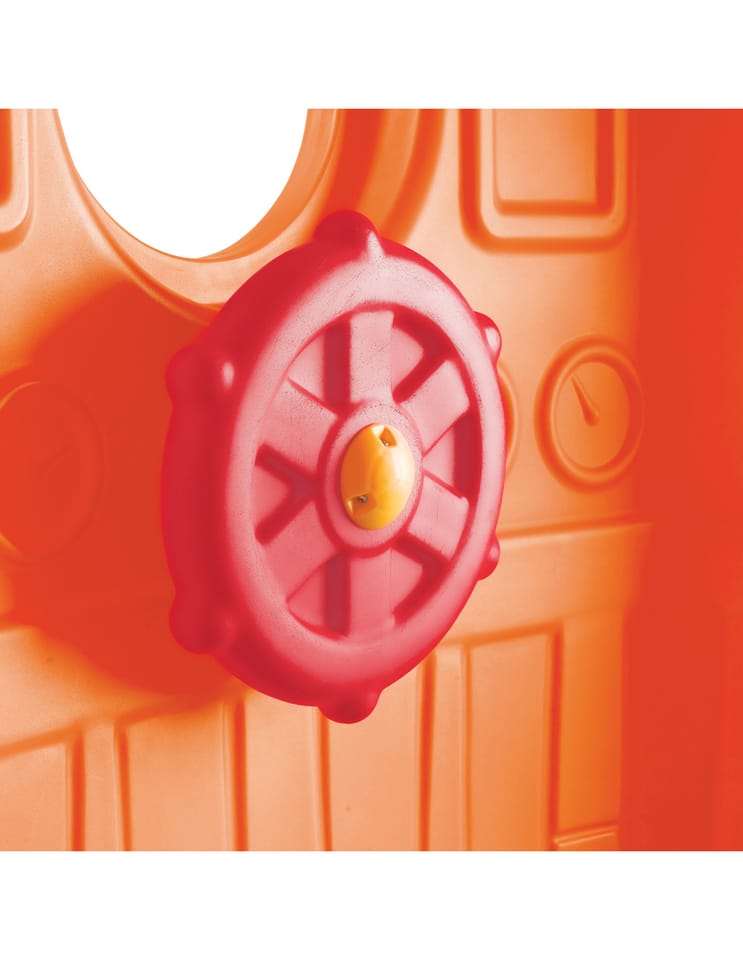 - - domek posiada drabinkę o dużych stopniach, poręcz pomagającą we wspinaczce, okrągłe okno, świetlik, koło sterowe oraz łagodną zjeżdżalnię o ślizgu 98 cm