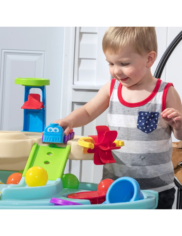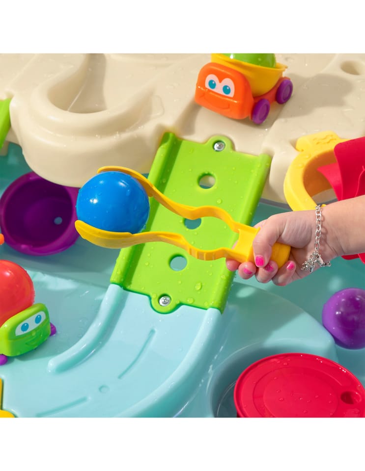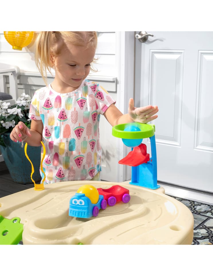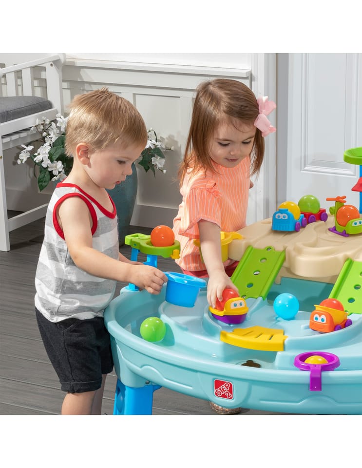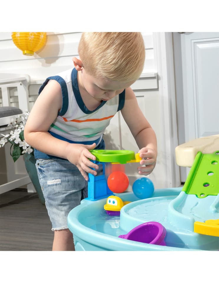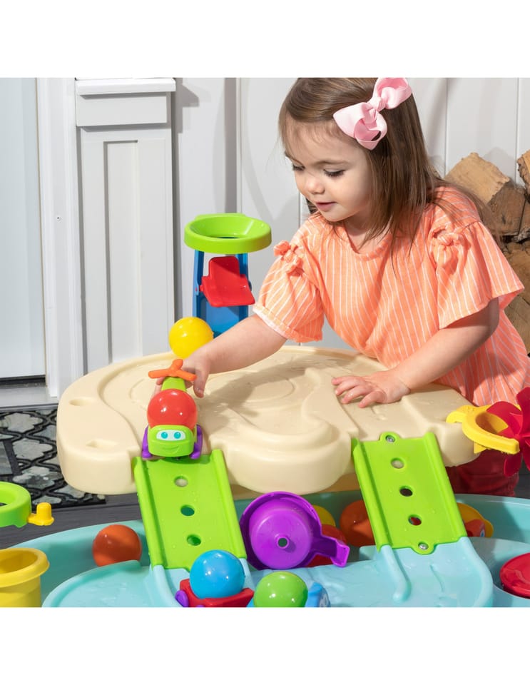 Dwupiętrowy stół dla dzieci Step2 Ball Buddies Adventure Center! Oprócz klasycznej wywrotki Ball Buddies, ten stół do zabawy na zewnątrz dla dzieci zawiera helikopter Ball Buddies, łódź i pociąg - które mogą przewozić dwie piłki do zabawy w tym samym czasie! Ball Buddies nie mogą się doczekać przygody wokół rzeki lub rejsu po zakrętach odlewanych dróg i mostów. Dzięki dużemu obszarowi, wielu dołączonym akcesoriom i wielu sposobom zabawy, ten dziecięcy stół wodny jest doskonałą opcją do zaangażowania się w zabawę społeczną dla wielu dzieci. Ponadto poszczególne stacje wokół basenu oferują dodatkowe opcje dla najmłodszych, którzy chcą bawić się sami. Mali poszukiwacze przygód mogą używać obręczy do rzucania piłek do wody i cieszyć się ekscytującą zabawą wodną za pomocą koła wodnego i dołączonych miarek. Na dnie znajduje się nawet interaktywne koło, dzięki czemu maluchy mogą wprawić wodę w ruch i stworzyć płynącą rzekę.