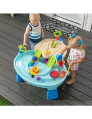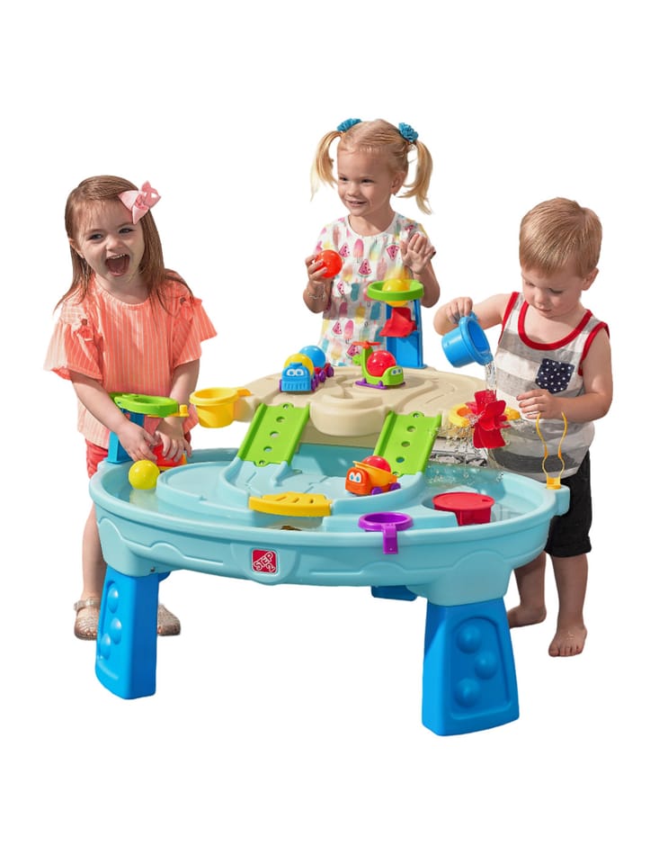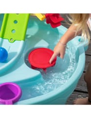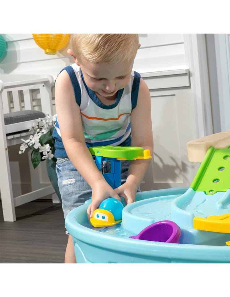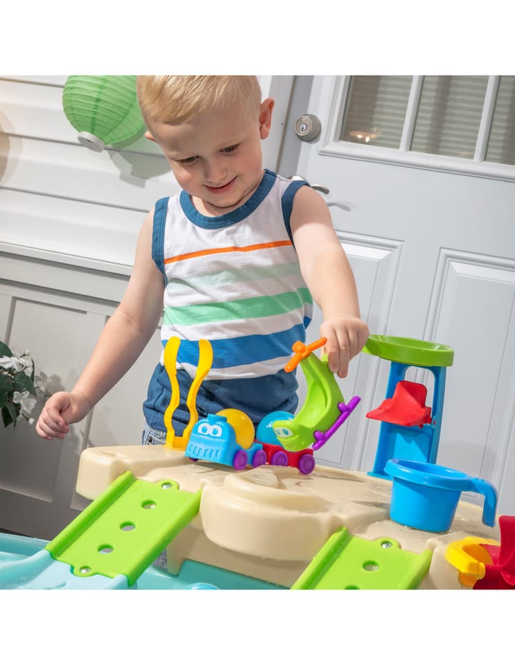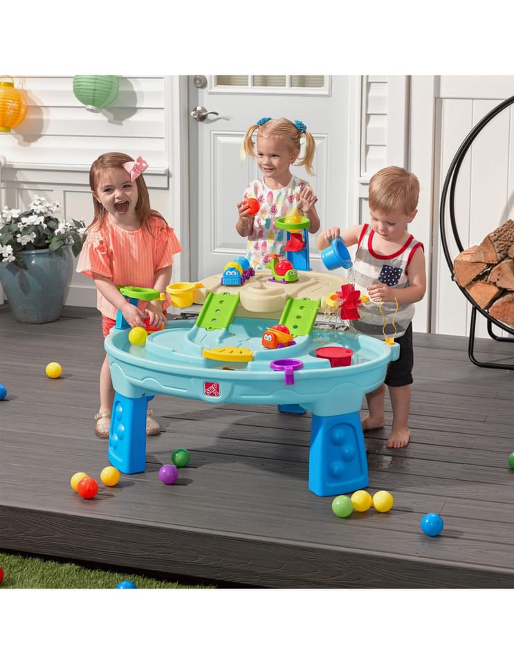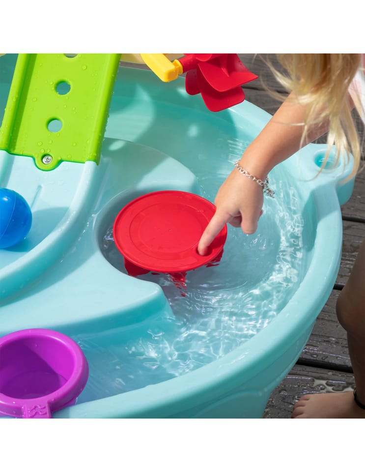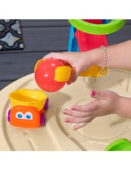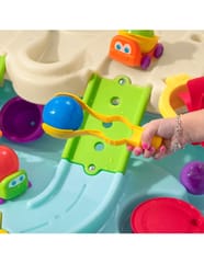 Dwupiętrowy stół dla dzieci Step2 Ball Buddies Adventure Center! Oprócz klasycznej wywrotki Ball Buddies, ten stół do zabawy na zewnątrz dla dzieci zawiera helikopter Ball Buddies, łódź i pociąg - które mogą przewozić dwie piłki do zabawy w tym samym czasie! Ball Buddies nie mogą się doczekać przygody wokół rzeki lub rejsu po zakrętach odlewanych dróg i mostów. Dzięki dużemu obszarowi, wielu dołączonym akcesoriom i wielu sposobom zabawy, ten dziecięcy stół wodny jest doskonałą opcją do zaangażowania się w zabawę społeczną dla wielu dzieci. Ponadto poszczególne stacje wokół basenu oferują dodatkowe opcje dla najmłodszych, którzy chcą bawić się sami. Mali poszukiwacze przygód mogą używać obręczy do rzucania piłek do wody i cieszyć się ekscytującą zabawą wodną za pomocą koła wodnego i dołączonych miarek. Na dnie znajduje się nawet interaktywne koło, dzięki czemu maluchy mogą wprawić wodę w ruch i stworzyć płynącą rzekę.