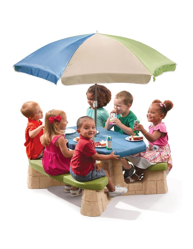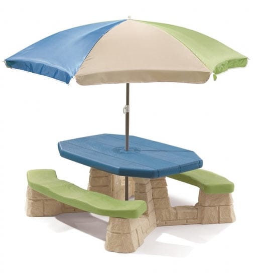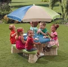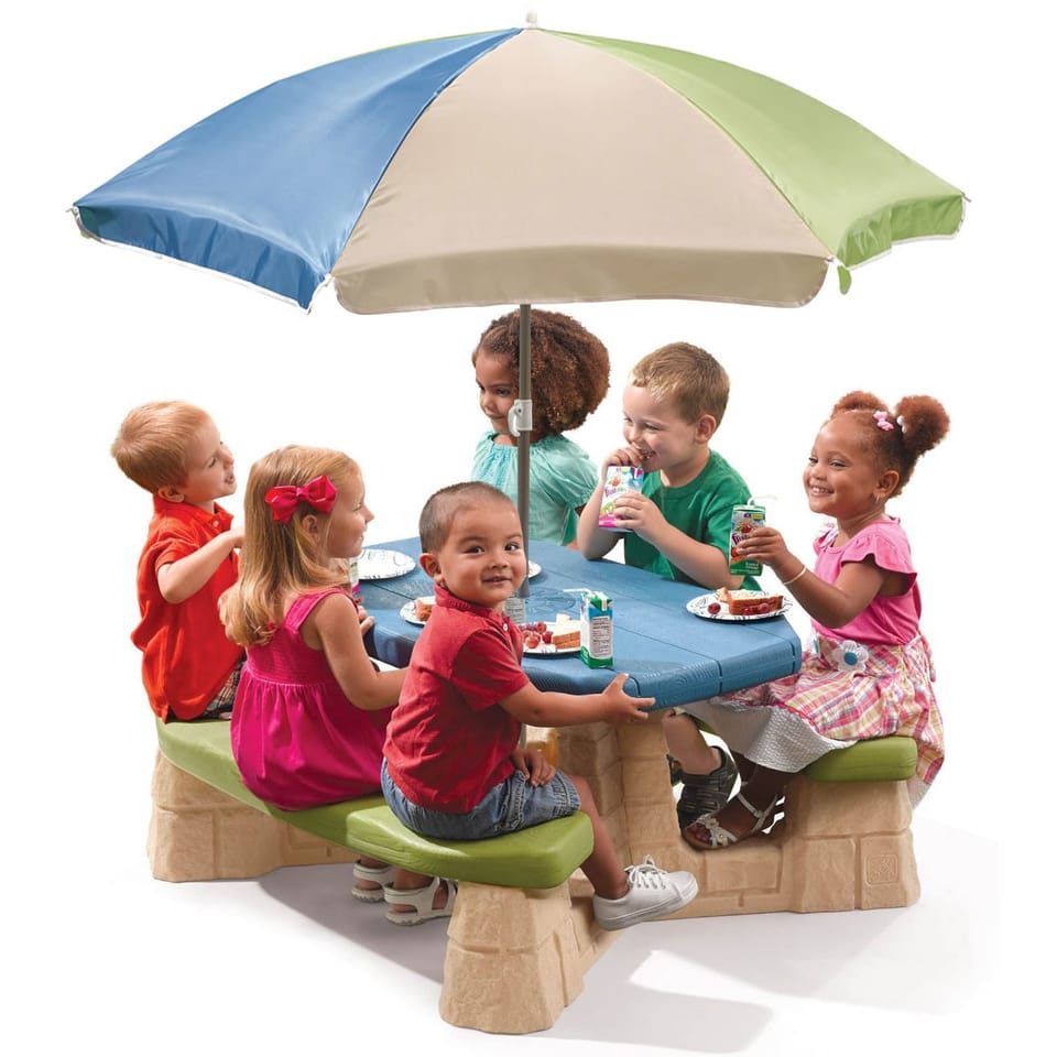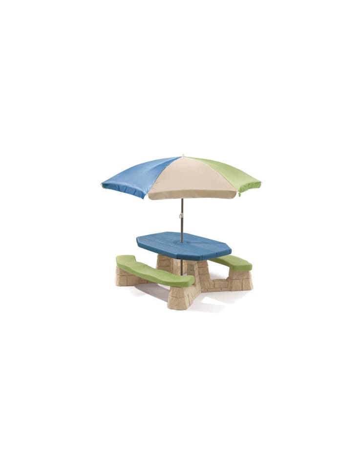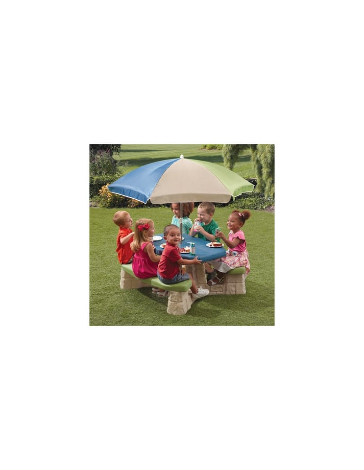 Stół piknikowy dla sześciorga dzieci z dwoma ławeczkami o specjalnym wyprofilowanym siedzisku. Wykonany z masywnego tworzywa sztucznego o podwójnych ściankach wypełnionych w środku powietrzem.Znaczna grubość elementów minimum 5 - 6 cm pozwala na długie użytkowanie stolika, a duży ponad 100 cm długości i szerokości 50 cm masywny blat oraz stabilna konstrukcja stołu zapewnia bezpieczeństwo zabawy. Dołączony parasol chroni przed promieniowaniem UV. Wysokość od ziemi do blatu stolika minimum 50 cm pozwala na korzystanie ze stolika dzieciom o różnym wzroście.