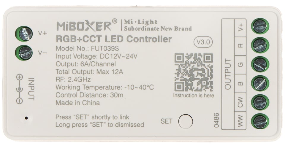 Sterownik oświetlenia FUT039S przeznaczony jest do kontrolowania załączenia, jasności świecenia oraz barwy pięciokanałowych taśm LED RGB+CCT (RGBWW)Sterowanie kontrolerem odbywa się za pomocą pilota bezprzewodowego pracującego w paśmie 2.4 GHz (dostępny osobno)