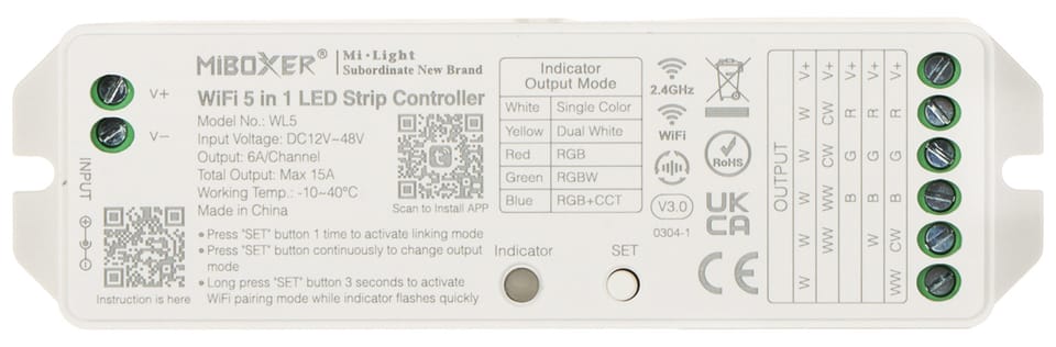 Sterownik oświetlenia WL5 przeznaczony jest do kontrolowania załączenia, jasności świecenia oraz barwy pięciokanałowych taśm LED RGB+CCT (RGBWW)Sterowanie kontrolerem możliwe jest za pośrednictwem sieci Wi-Fi przy użyciu aplikacji mobilnej MiBoxer oraz za pomocą pilota bezprzewodowego pracującego w paśmie 2.4 GHz (dostępny osobno)