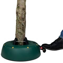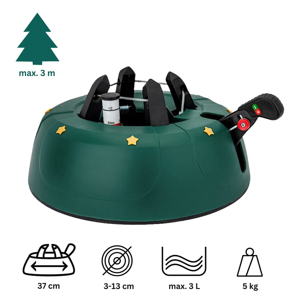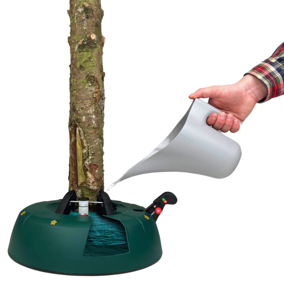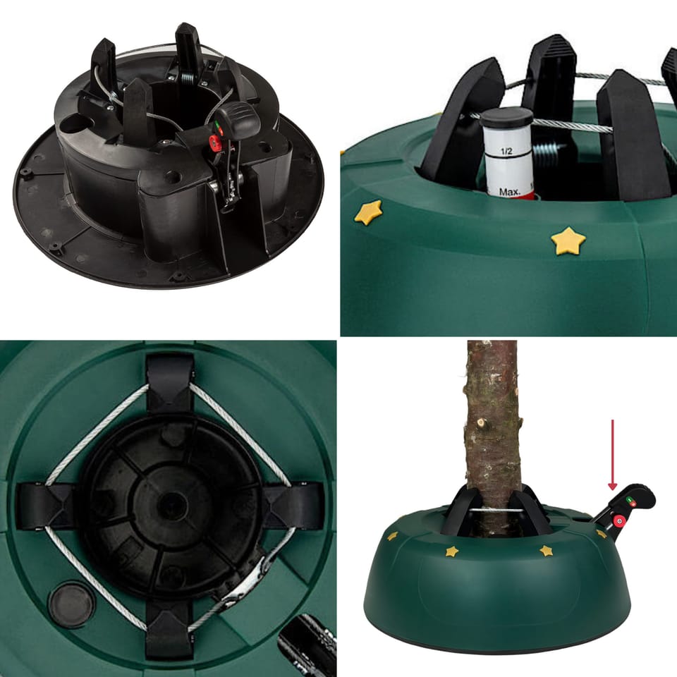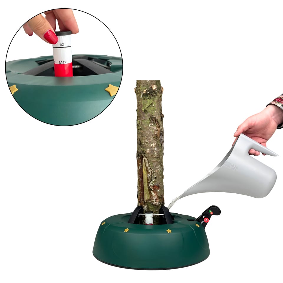 Stojak choinkowy Kamai® START 3.0, stworzony z myślą o choinkach do 3 metrów, oferuje stabilność dzięki obciążeniu 5 kg, pojemnikowi na 3 litry wody oraz opatentowanemu systemowi 4 haków, które automatycznie zaciskają pień. Wyposażony jest w wskaźnik poziomu wody, blokadę dźwigni zabezpieczającą przed przypadkowym otwarciem oraz solidny mechanizm zaciskowy.