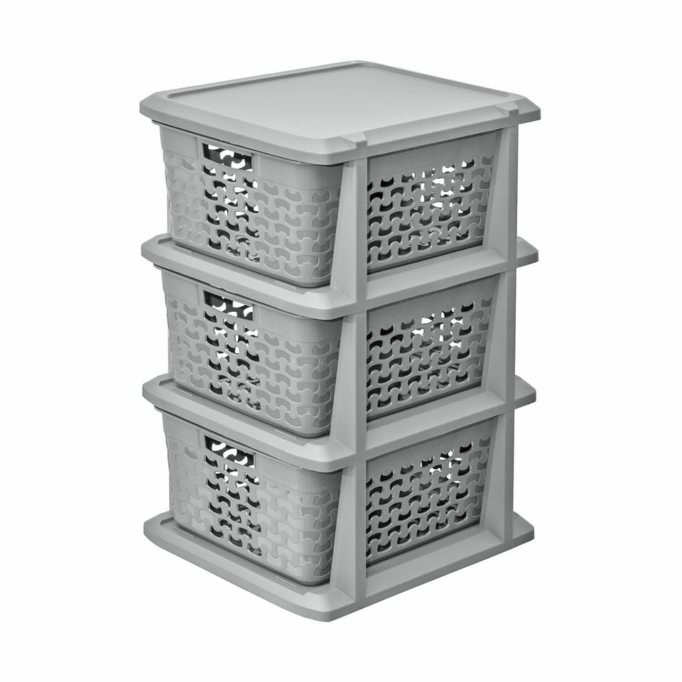 Cechy- Idealne rozwiązanie do przechowywania w małych przestrzeniach- 3 wysuwane kosze- Estetyczne wykonanie- Wysokiej jakości bezpieczny materiał (wolny od ftalanów i bpa)- Kolor: szary
