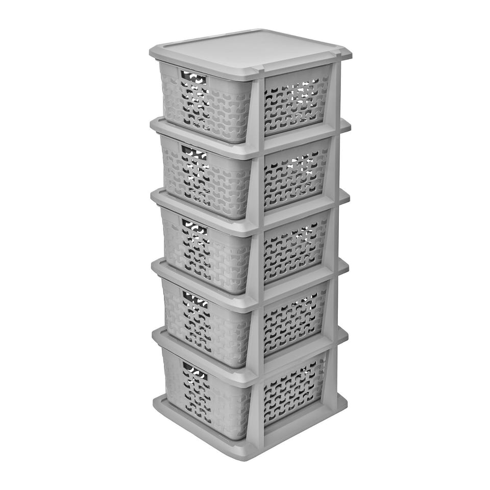 Cechy- Idealne rozwiązanie do przechowywania w małych przestrzeniach- 5 wysuwanych koszy- Estetyczne wykonanie- Wysokiej jakości bezpieczny materiał (wolny od ftalanów i bpa)- Kolor: szary