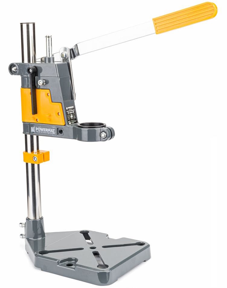 Stojak do wiertarki zmienia wiertarkę w wielofunkcyjne i praktyczne urządzenie. Stojak pozwala na pionową zmianę położenia zamocowanej wiertarki, dzięki czemu możliwa jest stabilna praca zmniejszająca prawdopodobieństwo złamania lub uszkodzenia wiertła. Doskonałe urządzenie do precyzyjnego wiercenia otworów w różnych materiałach. Korpus wykonany jest z aluminium, dzięki czemu całość jest lekka i wytrzymała. Obsługa zamocowanej wiertarki sprowadza się do sterowania dźwignią sprężynującą umożliwiającą samoczynny powrót wiertarki do pozycji początkowej. Stojak ma uniwersalne mocowanie do większości wiertarek ręcznych 38-41-43mm. Przydatny w każdym warsztacie domowym, jak i rzemieślniczym.
