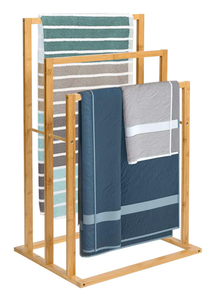 Stojak wieszak z bambusa 3 poziomyModel: Laos | Kolor: naturalny | Zakup od producenta Praktyczny i modny wieszak stojący na ręczniki, ubrania czy parasole. Doskonale sprawdzi się zarówno w przedpokoju jak i w garderobie czy łazience, jest bowiem odporny na wilgoć. Laos wykonano z naturalnego bambusa i zabezpieczony warstwą lakieru.3 wieszaki połączone ze sobą w odpowiedniej odległości pozwolą na szybkie osuszenie ręcznika czy ubrania. Cechy produktuUniwersalne zastosowanieKompaktowe wymiaryBez wiercenia Ekologiczne wzornictwo z bambusaSzybki montaż.Wymiary produktuWysokość ramion: 81 cm, 69 cm, 59 cmSzerokość: 50 cmGłębokość: 38 cmOdstęp ramion: 10,5 cm Informacje dodatkowePrzedstawione kolory należy traktować poglądowo - mogą odbiegać od rzeczywistych ze względu na różne ustawienia monitorów oraz proces obróbki zdjęć. Rzeczywiste wymiary mogą się różnić od podanych wyżej. Tolerancja błędów może wynosić +/- 5%. Marka:GockowiakKod produktu:5902340320693Kod EAN:5902340320693Kolor:naturalnyWysokość całkowita: 81 cmSzerokość całkowita:50 cmGłębokość całkowita38 cmMateriały:bambus