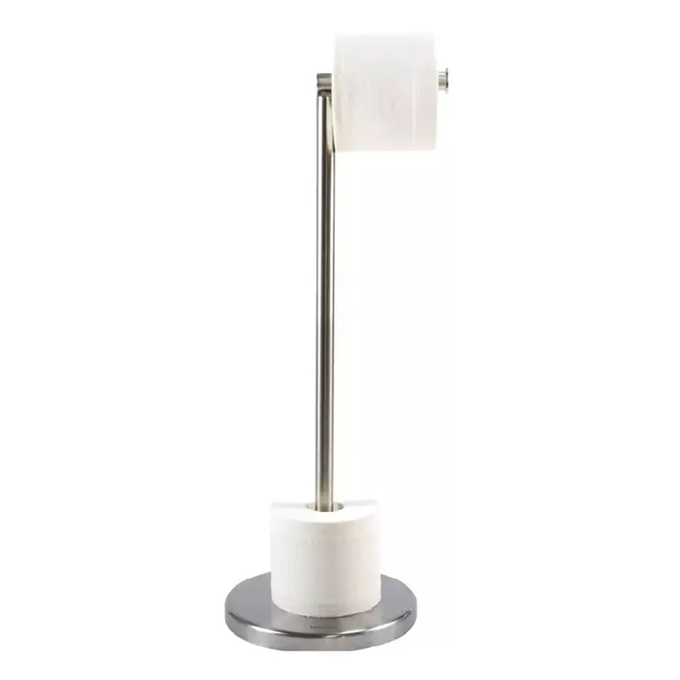 Stojak łazienkowy łączy w sobie 2 elementy w jednym: uchwyt na papier toaletowy i uchwyt do przechowywania rolek. Z pewnością doda każdej łazience eleganckiego charakteru i utrzyma papier w łatwo dostępnym miejscu.