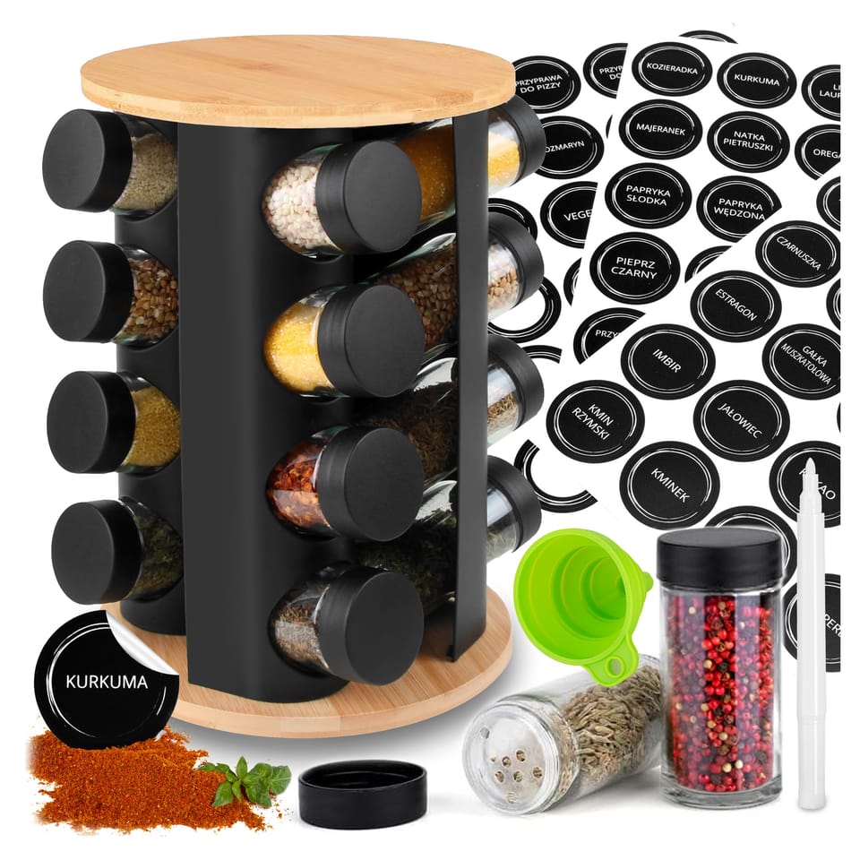 Stojak na przyprawy ROMERO obrotowy 16 słoiczków + 72 naklejki⭐️ Aż 16 słoiczków w zestawie⭐️ Praktyczny, funkcjonalny, obrotowy 360°⭐️ 72 naklejki w zestawie + marker + lejek do przypraw⭐️ Estetyczne wykonanie i wysoka jakość⭐️ Zakup od producenta✨Stojak na przyprawy Romero - Praktyczny i obrotowy organizer z 16 pojemnikami!✨Odkryj stojak na przyprawy Romero, wyjątkowy produkt, który wzbogaci twoją kuchnię o nowy wymiar organizacji i łatwości w gotowaniu. Wykonany z trwałego drewna bambusowego i metalu, jest praktyczny i prezentuje się nie stylowo. Dzięki zdolności obrotu o pełne 360 stopni, możesz szybko znaleźć potrzebną przyprawę, bez tracenia czasu na przeszukiwanie półek. Stojak jest wyposażony w 16 szklanych pojemników, które nie tylko umożliwiają łatwe przechowywanie, ale także pozwolą ci utrzymać porządek w swojej kuchni. Przyprawy zawsze będą na wyciągnięcie ręki, gotowe do dodania niepowtarzalnych smaków do twoich potraw. CechyObrotowy 360 stopniDrewno bambusowe i metal16 szklanych pojemników72 naklejki na przyprawyPraktyczność i organizacjaŁatwa konserwacja WymiaryStojak:Wysokość: 28 cmGłębokość: 19,5 cmSzerokość: 19,5 cmSłoik:Wysokość: 9,5 cmSzerokość: 4,3 cmGłębokość: 4,3 cm Informacje dodatkowePrzedstawione kolory należy traktować poglądowo - mogą odbiegać od rzeczywistych ze względu na różne ustawienia monitorów oraz proces obróbki zdjęć. Rzeczywiste wymiary mogą się różnić od podanych wyżej. Tolerancja błędów może wynosić +/- 5%.Marka:GockowiakKod EAN:5902340331972Wysokość stojaka:28 cmSzerokość stojaka:19,5 cmMateriały:drewno bambusowe, szkło, metalObrotowy:tak