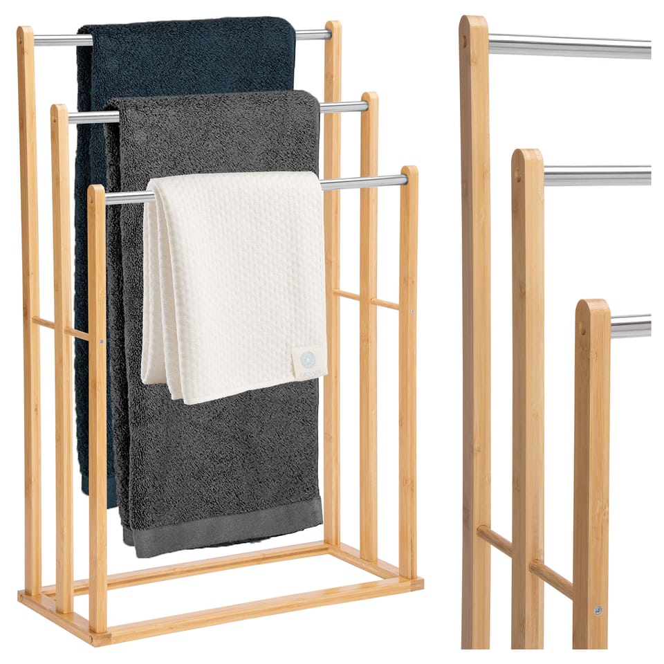 Stojak na ręczniki BRANDO naturalny⭐️ Wykonany z naturalnego drewna bambusowego⭐️ 3 stalowe ramiona na ręczniki⭐️ Wsporniki boczne⭐️ Zakup od producentaWieszak na ręczniki Brando to stylowe i funkcjonalne rozwiązanie do łazienki lub pralni. Trzy drążki na różnych wysokościach zapewniają optymalną cyrkulację powietrza i szybkie suszenie ręczników. Wykonany z trwałego, lakierowanego bambusa, jest odporny na wilgoć i łatwy w montażu. Wolnostojąca konstrukcja nie wymaga wiercenia, a kompaktowe wymiary sprawiają, że pasuje nawet do małych pomieszczeń. Elegancja i ekologia w jednym! ✅ Wykonany z naturalnego bambusa✅ Trzy stalowe uchwyty na ręczniki✅ Odpowiednio rozmieszczone ramiona, zapewniające lepsze suszenie✅ Boczne wsporniki dla dodatkowej stabilności✅ Solidna i trwała podstawa✅ Elegancki, nowoczesny wyglądSpecyfikacja:Trzy drążki: Różne wysokości (82 cm, 72 cm, 62 cm) dla lepszej cyrkulacji powietrza.Wolnostojący: Nie wymaga wiercenia, idealny do wynajmowanych mieszkań.Kompaktowe wymiary: Pasuje nawet do małych łazienek (82 x 54,5 x 24 cm).Ekologiczny materiał: Trwały, lakierowany bambus odporny na wilgoć.Łatwy montaż: Gotowy do użycia w kilka minut.Wymiary:Wysokość ramion: 82 cm, 72 cm, 62 cmSzerokość: 52,5 cmGłębokość: 24 cmOdstęp ramion: 8,5 cm ✅ Wykonany z naturalnego drewna bambusowegoKonstrukcja z bambusa jest ekologiczna, wytrzymała i nadaje łazience ciepły, naturalny wygląd. ✅Trzy wytrzymałe stalowe uchwyty na ręcznikiStojak Brando posiada trzy mocne stalowe uchwyty, które gwarantują trwałość i funkcjonalność. Umożliwiają one wygodne rozwieszenie kilku ręczników naraz, zapewniając ich stabilne utrzymanie na miejscu. To praktyczne rozwiązanie, które pomoże Ci zadbać o porządek i organizację w Twojej łazience! ✅ Wsporniki boczneStojak Brando został wyposażony w praktyczne wsporniki boczne, które zwiększają jego stabilność i zapobiegają przypadkowemu przewróceniu się, nawet przy pełnym obciążeniu. ✅ Optymalny odstęp między uchwytami, wspomagający suszenie ręcznikówStojak został zaprojektowany z odpowiednimi odstępami między uchwytami, co umożliwia swobodny przepływ powietrza. Dzięki temu ręczniki schną efektywniej, pozostając świeże i suche. To praktyczne rozwiązanie, które podnosi komfort użytkowania i dba o higienę w Twojej łazience! ✅ Stabilna podstawaStojak Brando został wyposażony w stabilną podstawę, która zapewnia pewne ustawienie nawet przy pełnym obciążeniu.❓Najczęściej zadawane pytania (Q&A)❓➡️ Czy stojak sprawdzi się w małych łazienkach?Oczywiście! Stojak Brando został zaprojektowany z myślą o kompaktowych przestrzeniach, dzięki czemu zajmuje niewiele miejsca i pasuje nawet do niewielkich łazienek.➡️ Jakie rodzaje ręczników można na nim zawiesić?Stojak jest odpowiedni zarówno do dużych ręczników kąpielowych, jak i mniejszych ręczników do rąk czy ściereczek, zapewniając wygodne przechowywanie.➡️ Jak utrzymać stojak w dobrym stanie?Regularne czyszczenie wilgotną ściereczką oraz osuszanie powierzchni pozwoli zachować jego estetykę i trwałość na lata.➡️ Czy stojak jest stabilny?Tak, stabilność zapewniają solidne stalowe ramiona, a lekka konstrukcja umożliwia łatwe przenoszenie w razie potrzeby.UWAGA | Przedstawione kolory należy traktować poglądowo - mogą odbiegać od rzeczywistych ze względu na różne ustawienia monitorów oraz proces obróbki zdjęć • Rzeczywiste wymiary mogą się różnić od podanych w opisie. Tolerancja błędów może wynosić +/- 2 cm.