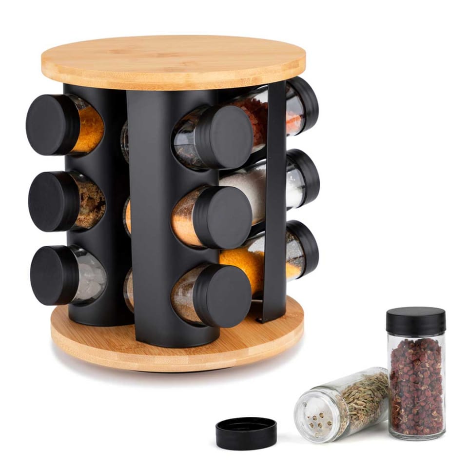 Stojak obrotowy na przyprawy z 12 szklanymi pojemnikami to funkcjonalne i eleganckie rozwiązanie, które pozwala mieć ulubione przyprawy zawsze pod ręką i dodaje porządku kuchennemu blatu.