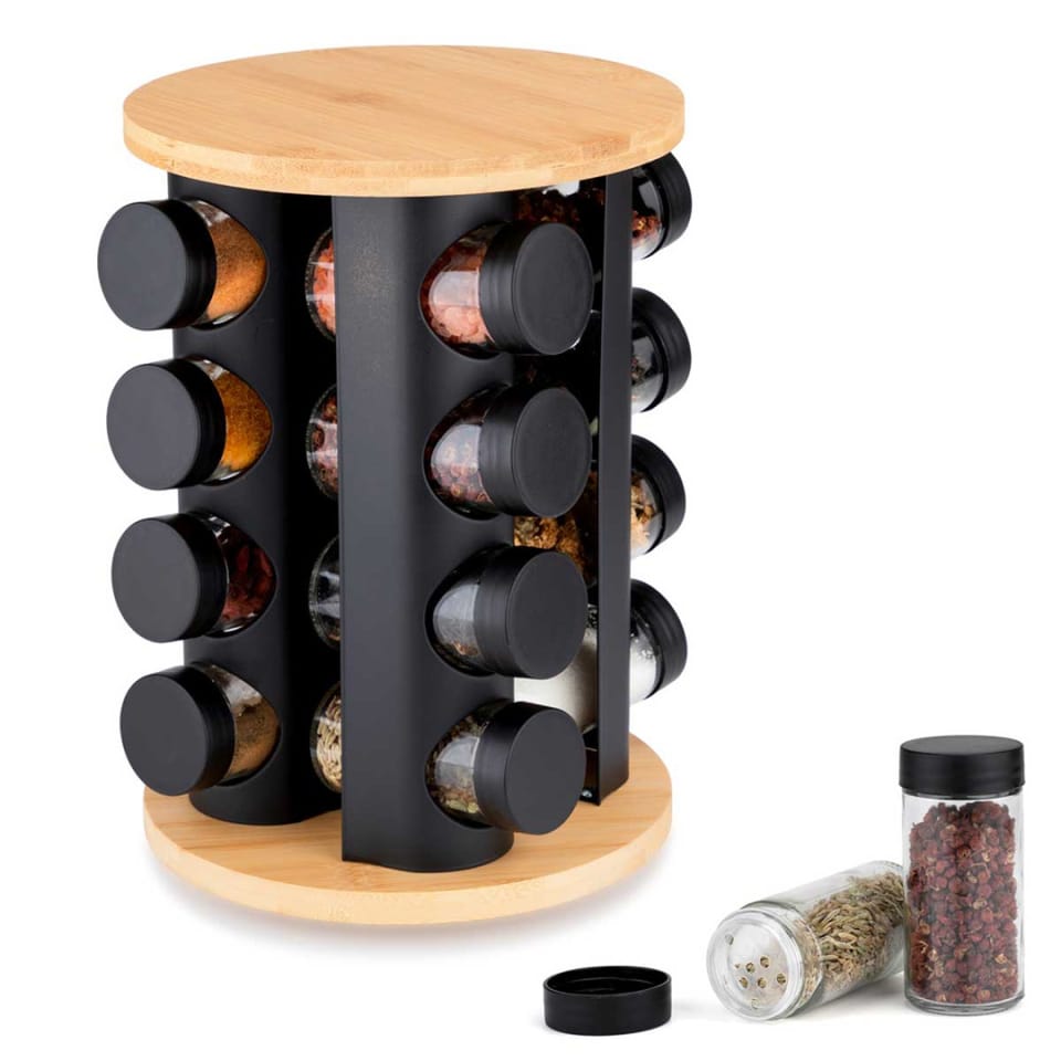 Stojak obrotowy na przyprawy z 16 szklanymi pojemnikami to funkcjonalne i eleganckie rozwiązanie, które pozwala mieć ulubione przyprawy zawsze pod ręką i dodaje porządku kuchennemu blatu.