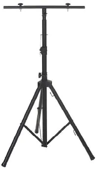 Solidny stojak z metalowymi płytkami na nóżkach dla lepszej stabilności, o regulowanej wysokości, z hakiem do zawieszania kabla.