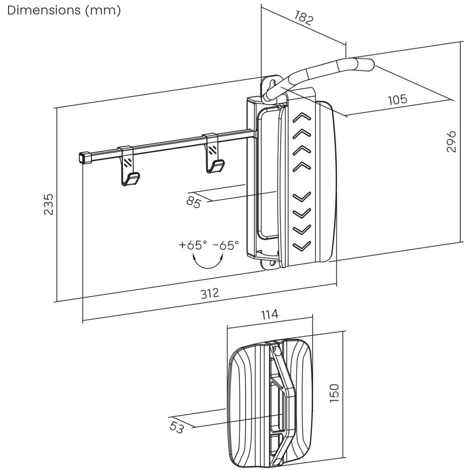Żeby zawiesić rower wystarczy przełożyć obręcz przedniego koła przez hak na uchwycie. Dzięki temu rower jest podtrzymywany za pomocą koła, co minimalizuje ryzyko uszkodzenia ramy lub innych części roweru. Uchwyt zapewnia stabilność i bezpieczeństwo, utrzymując rower w pionowej pozycji. Po zawieszeniu roweru uchwyt można obrócić w lewo lub prawo o 65 stopni, co pozwala na przechowywanie roweru bliżej ściany. Hak pokryty jest gumą zabezpieczająca obręcz koła roweru przed zarysowaniami.
