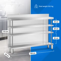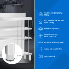 Kod produktu: 1031640Stół roboczy barowy ze stali nierdzewnej pozwoli zachować porządek wśród najpotrzebniejszych przyborów w jednym miejscu. Wyposażony w cztery półki i otwartą powierzchnię roboczą, oferuje dużo miejsca i możliwość przejrzystej organizacji stanowiska pracy. Dzięki ulepszonej konstrukcji i płycie MDF pod górną półką stół roboczy zniesie obciążenie do 450 kg, więc zapewni wystarczającą nośność dla ciężkiego sprzętu i akcesoriów. Dzięki rantowi ochronisz swoje otoczenie przed zachlapaniem i zabrudzeniem oraz zapobiegnie on spadaniu przyborów za ladę. Pozwoli to nie tylko utrzymać porządek, ale i zapewnić bezpieczeństwo podczas pracy. Lada barowa zachwyci Cię trwałą i łatwą w utrzymaniu konstrukcją. Wykonanie z wysokiej jakości stali nierdzewnej sprawia, że mebel jest odporny na korozję i uderzenia. Gładkie powierzchnie są z kolei łatwe w czyszczeniu, a tym samym nie wymagają częstej konserwacji. Kolejnym atutem jest stabilne ustawienie stołu ze stali nierdzewnej. Nóżki o wysokości 15 cm dostosujesz do nierównej podłogi nawet o 2 cm, zapewniając optymalną stabilność. Ten stół roboczy barowy to idealny wybór dla każdego, kto ceni funkcjonalność, trwałość i czyste stanowisko pracy.Cechy produktu: