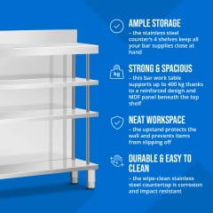 - - Dużo miejsca - stół roboczy barowy posiada 4 półki, na których przechowasz w zasięgu ręki wszystko, czego potrzebujesz do pracy przy barze,