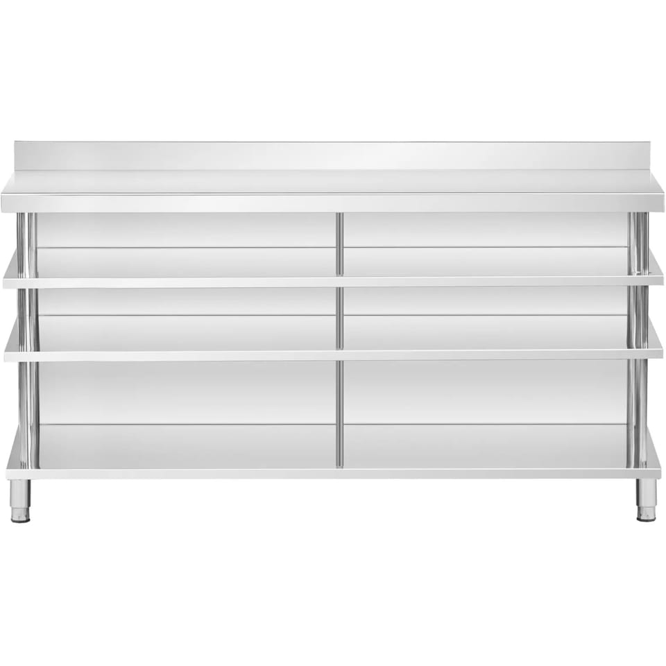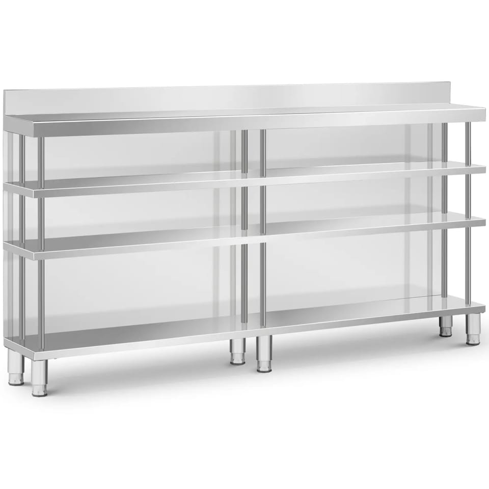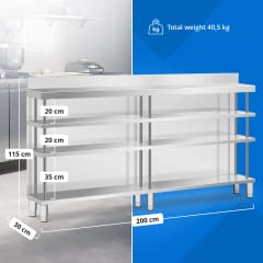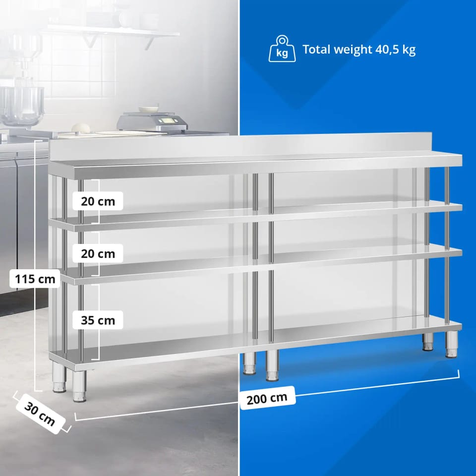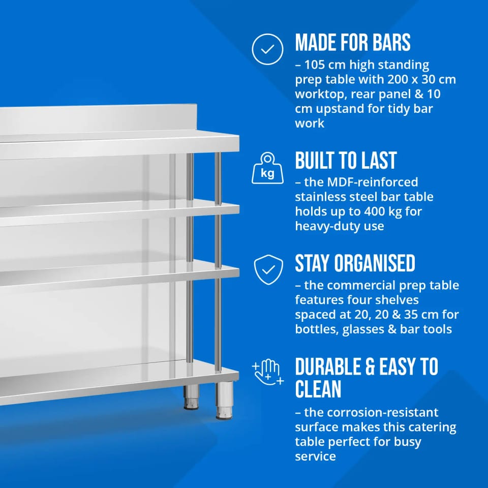 Kod produktu: 1031642Stół roboczy barowy marki Royal Catering ze stali nierdzewnej o wysokości 105 cm oraz powierzchni roboczej 200 x 30 cm oferuje dużo miejsca i możliwość przejrzystej organizacji stanowiska pracy w gastronomii. Rant o wysokości 10 cm ochroni ścianę i otoczenie przed zachlapaniem i zabrudzeniem. Ponadto zapobiegnie spadaniu przyborów za ladę. Dzięki ulepszonej konstrukcji i płycie MDF pod górną półką lada barowa zniesie obciążenie do 450 kg, więc zapewni wystarczającą nośność dla ciężkiego sprzętu, akcesoriów oraz dużej ilości zapasów. Pozwoli to nie tylko utrzymać porządek, ale i zapewnić bezpieczeństwo podczas pracy. Lada barowa zachwyci Cię trwałością i łatwością w utrzymaniu czystości konstrukcją, dzięki wykonaniu z wysokiej jakości stali nierdzewnej odpornej na korozję i uderzenia. Stół barowy wyposażono w cztery przestronne półki rozmieszczone w odstępach 20, 20 i 35 cm. Zapewniają one dużo miejsca na butelki, szklanki i różne akcesoria. Ponadto nóżki o regulowanej wysokości do 2 cm pozwalają znaleźć stabilną pozycję na różnych, nawet nierównych powierzchniach. Dno znajduje się 15 cm od podłogi, co umożliwia łatwe sprzątanie pod stołem. Montaż jest szybki i prosty dzięki dołączonemu kluczowi imbusowemu.Cechy produktu: