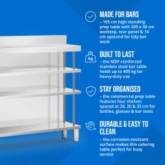 - - Specjalnie dla barów - stół roboczy o wysokości 105 cm z powierzchnią roboczą 200 x 30 cm oraz rantem 10 cm świetnie sprawdzi się w lokalach gastronomicznych,