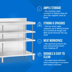 - - Dużo miejsca - stół roboczy barowy posiada 4 półki, na których przechowasz w zasięgu ręki wszystko, czego potrzebujesz do pracy przy barze,