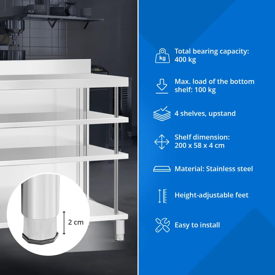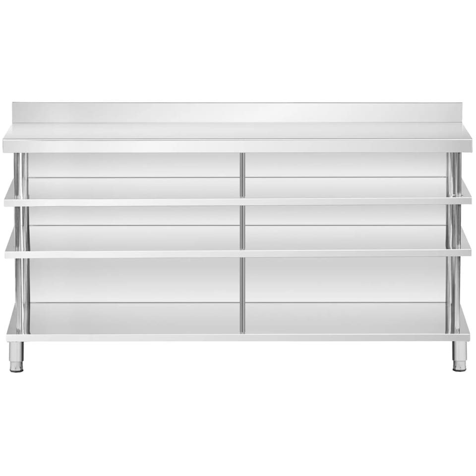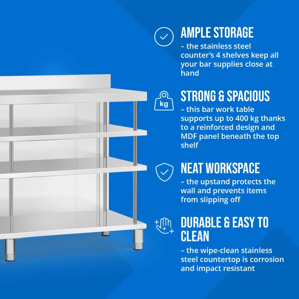 Kod produktu: 1031643Stół roboczy barowy marki Royal Catering ze stali nierdzewnej pozwoli zachować porządek wśród najpotrzebniejszych przyborów w jednym miejscu. Wyposażony w cztery półki i otwartą powierzchnię roboczą, oferuje dużo miejsca i możliwość przejrzystej organizacji stanowiska pracy. Dzięki ulepszonej konstrukcji i płycie MDF pod górną półką stół roboczy zniesie obciążenie do 450 kg, więc zapewni wystarczającą nośność dla ciężkiego sprzętu i akcesoriów. Dzięki rantowi ochronisz swoje otoczenie przed zachlapaniem i zabrudzeniem oraz zapobiegnie on spadaniu przyborów za ladę. Pozwoli to nie tylko utrzymać porządek, ale i zapewnić bezpieczeństwo podczas pracy. Lada barowa zachwyci Cię trwałą i łatwą w utrzymaniu konstrukcją. Wykonanie z wysokiej jakości stali nierdzewnej sprawia, że mebel jest odporny na korozję i uderzenia. Gładkie powierzchnie są z kolei łatwe w czyszczeniu, a tym samym nie wymagają częstej konserwacji. Kolejnym atutem jest stabilne ustawienie stołu ze stali nierdzewnej. Nóżki o wysokości 15 cm dostosujesz do nierównej podłogi nawet o 2 cm, zapewniając optymalną stabilność. Ten stół roboczy barowy to idealny wybór dla każdego, kto ceni funkcjonalność, trwałość i czyste stanowisko pracy.Cechy produktu: