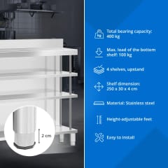 - - Dużo miejsca - stół roboczy barowy posiada 4 półki, na których przechowasz w zasięgu ręki wszystko, czego potrzebujesz do pracy przy barze,