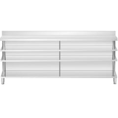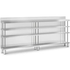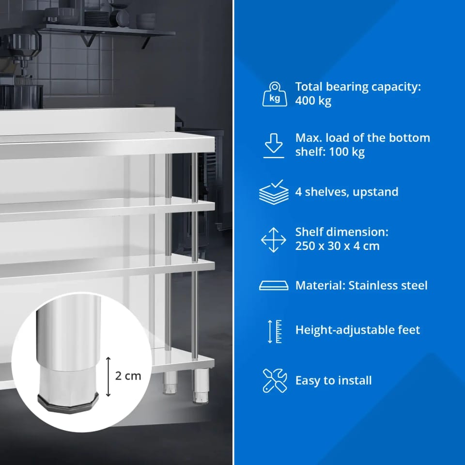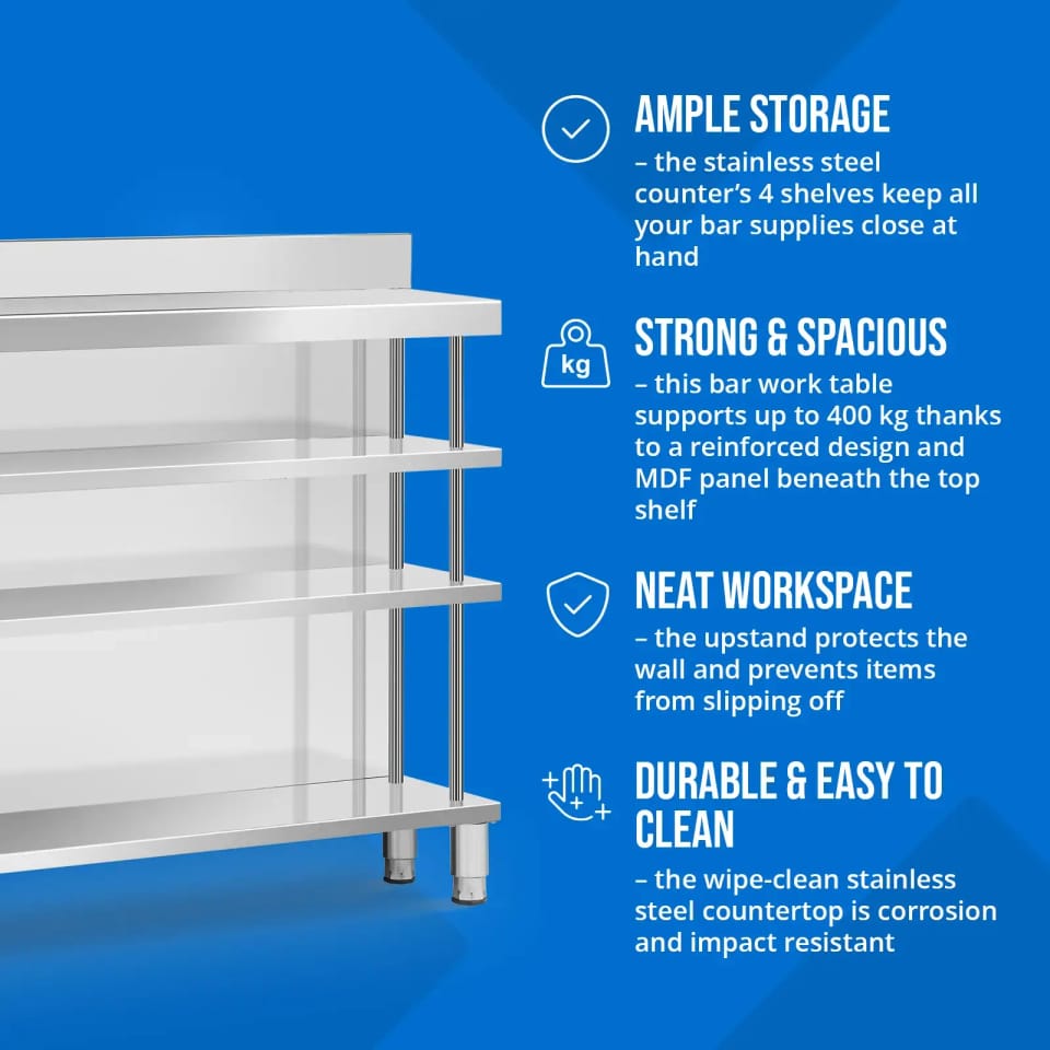 Kod produktu: 1031644Stół roboczy barowy marki Royal Catering ze stali nierdzewnej pozwoli zachować porządek wśród najpotrzebniejszych przyborów w jednym miejscu. Wyposażony w cztery półki i otwartą powierzchnię roboczą, oferuje dużo miejsca i możliwość przejrzystej organizacji stanowiska pracy. Dzięki ulepszonej konstrukcji i płycie MDF pod górną półką stół roboczy zniesie obciążenie do 450 kg, więc zapewni wystarczającą nośność dla ciężkiego sprzętu i akcesoriów. Dzięki rantowi ochronisz swoje otoczenie przed zachlapaniem i zabrudzeniem oraz zapobiegnie on spadaniu przyborów za ladę. Pozwoli to nie tylko utrzymać porządek, ale i zapewnić bezpieczeństwo podczas pracy. Lada barowa zachwyci Cię trwałą i łatwą w utrzymaniu konstrukcją. Wykonanie z wysokiej jakości stali nierdzewnej sprawia, że mebel jest odporny na korozję i uderzenia. Gładkie powierzchnie są z kolei łatwe w czyszczeniu, a tym samym nie wymagają częstej konserwacji. Kolejnym atutem jest stabilne ustawienie stołu ze stali nierdzewnej. Nóżki o wysokości 15 cm dostosujesz do nierównej podłogi nawet o 2 cm, zapewniając optymalną stabilność. Ten stół roboczy barowy to idealny wybór dla każdego, kto ceni funkcjonalność, trwałość i czyste stanowisko pracy.Cechy produktu: