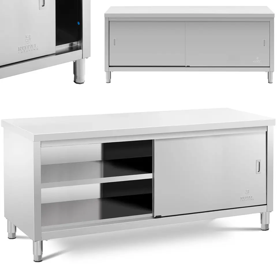 Kod producenta: 10011670Stół gastronomiczny marki Royal Catering sprawdzi się w restauracjach, hotelach, stołówkach, sklepach itp. Duża szafka zapewnia dodatkową przestrzeń do przechowywania przyborów kuchennych. Zamykana jest przesuwnymi drzwiami, które zajmują niewiele miejsca, są bezpieczne w użyciu i zapewniają łatwy dostęp do wnętrza. Mebel wykonany został ze stali nierdzewnej, jest odporny na uszkodzenia i trwałe zabrudzenia. Jego konstrukcja wytrzymuje obciążenie do 600 kg.Cechy produktu: