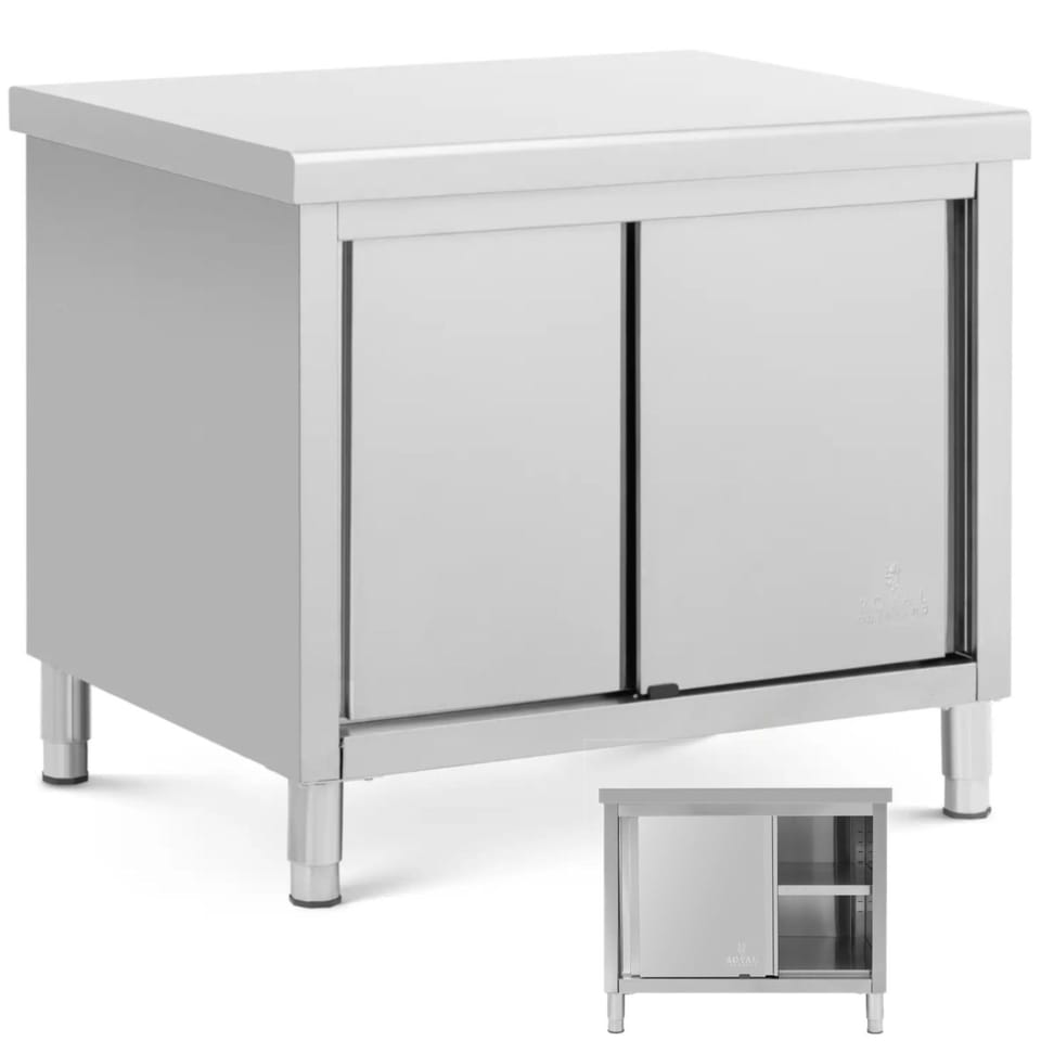 Kod producenta: 10013452Stół roboczy z szafką ze stali nierdzewnej marki Royal Catering o nośności do 500 kg na trzech poziomach sprawdzi się w branży gastronomicznej oraz wielu innych. Dzięki wzmocnionej płytą MDF powierzchni roboczej o wymiarach 100 x 80 cm stół oferuje dużo miejsca do pracy. Środkową półkę można zamontować na różnych wysokościach, dzięki czemu dostosujesz przestrzeń na różne przybory i narzędzia. Połączenie blatu roboczego i szafki do przechowywania pozwala na szeroki zakres zastosowań i ułatwia utrzymanie porządku w kuchni. Szafka robocza ze stali nierdzewnej z przesuwnymi drzwiami zapewnia optymalne wykorzystanie przestrzeni w wąskich kuchniach oraz cichą i płynną obsługę. Wysokiej jakości stal nierdzewna spełnia wymagania branży gastronomicznej, gwarantując trwałość i łatwość czyszczenia. Ponadto nóżki o regulowanej wysokości do 2 cm pozwalają znaleźć stabilną pozycję na różnych, nawet nierównych powierzchniach. Dno znajduje się 15 cm od podłogi, co umożliwia łatwe sprzątanie pod szafką. Idealnie sprawdzi się ona w restauracjach i firmach cateringowych, łącząc w sobie funkcjonalność i wytrzymałość oraz zachowując przy tym profesjonalny, elegancki wygląd.Cechy produktu: